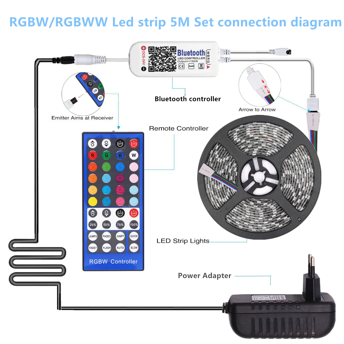 Если вы покупаете: набор светодиодных лент 5 м RGBWW, вы получите: 1*5 м RGBWW Светодиодная лента + 1 * RGBW Bluetooth контроллер + 1 * 3A источник питания (вилка отправляется в соответствии с вашим выбором покупки)