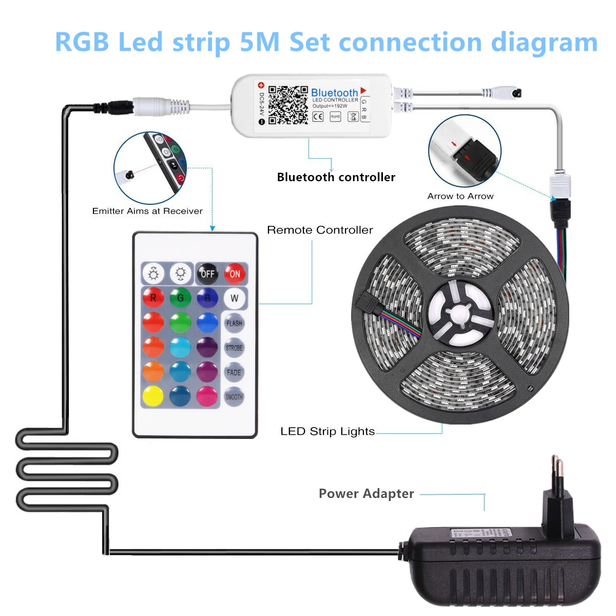Посылка: Если вы покупаете: набор светодиодных лент RGB 5 м, вы получите: 1*5 м RGB Светодиодная лента + 1 * RGB Bluetooth контроллер + 1 * 3A источник питания (вилка отправляется в соответствии с вашим выбором покупки)