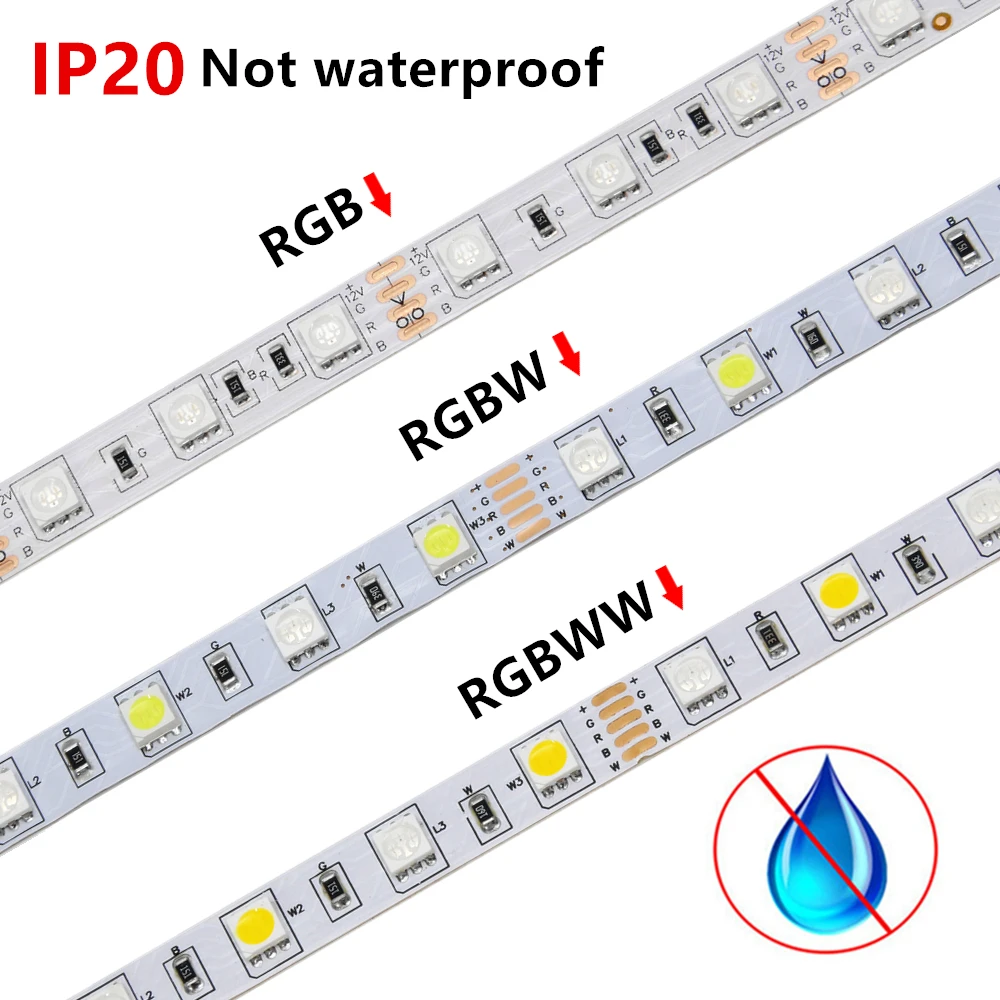 Спецификация: Светодиодный Тип: 5050 SMD светодиодный Количество СВЕТОДИОДНЫЙ: 300 светодиодный s/5 м (60 Светодиодный s/метр) Степень защиты: IP20 (не водонепроницаемый, только для использования в помещении) или IP65 водонепроницаемый Рабочее Входное напряжение: 12 В постоянного тока Регулировка яркости: Да (требуется диммер) Цвет излучения: RGB/RGBW/RGBWW