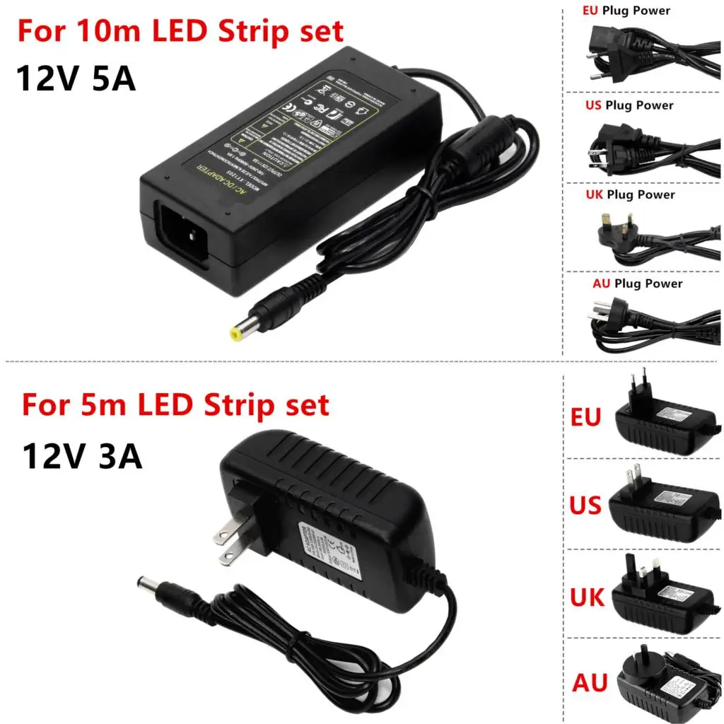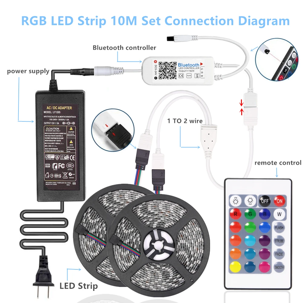 Если вы покупаете: набор светодиодных лент RGB 10 м, вы получите: 2*5 м RGB Светодиодная лента + 1 * RGB Bluetooth контроллер + 1*1-2 провода + 1 * 5A источник питания (вилка отправляется в соответствии с вашим выбором покупки)