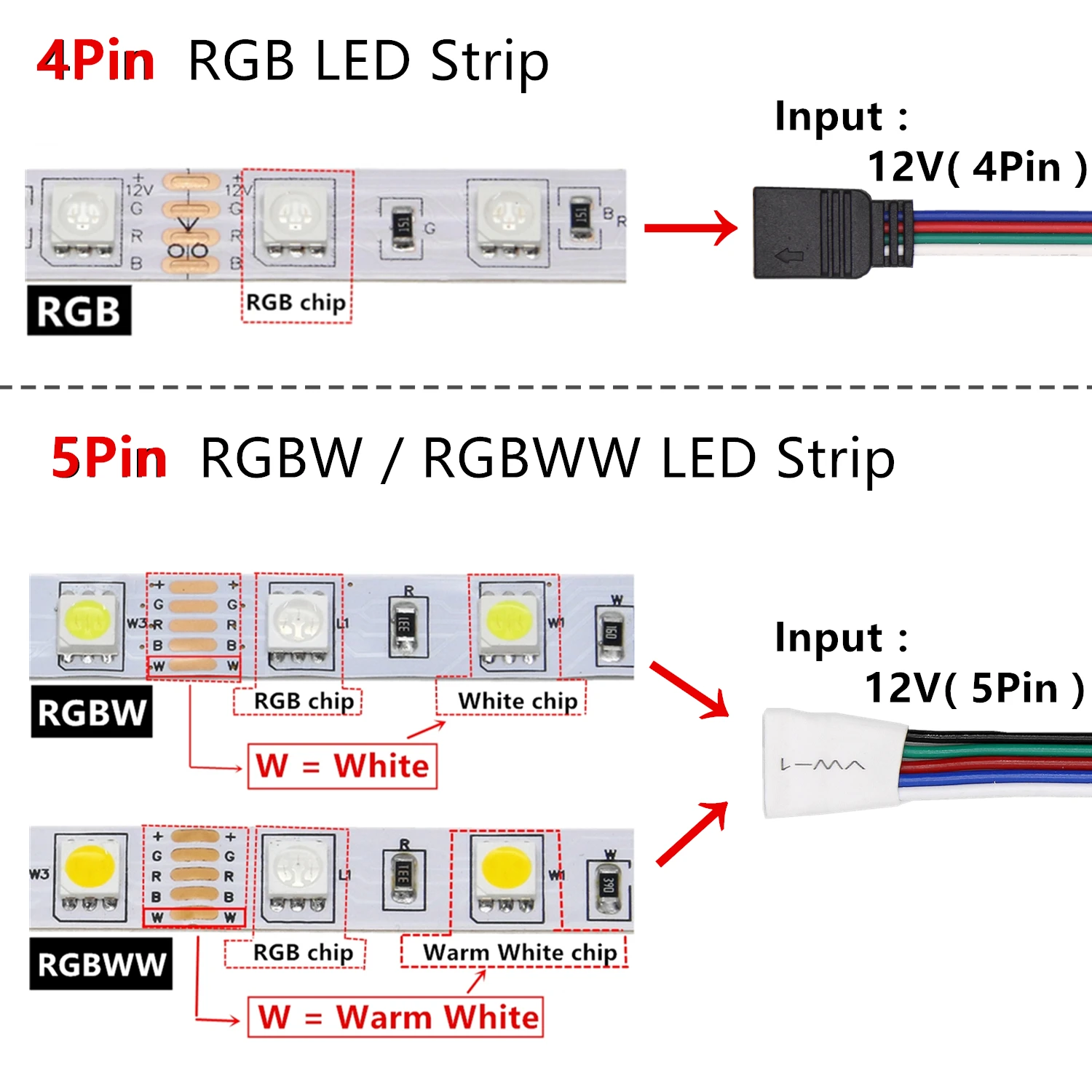 3: RGBWW-5 контактов, а «W» на светодиодной ленте RGBWW-теплый белый, а не белый светильник. Вы также можете просмотреть подробное изображение нашего продукта. Спасибо вам