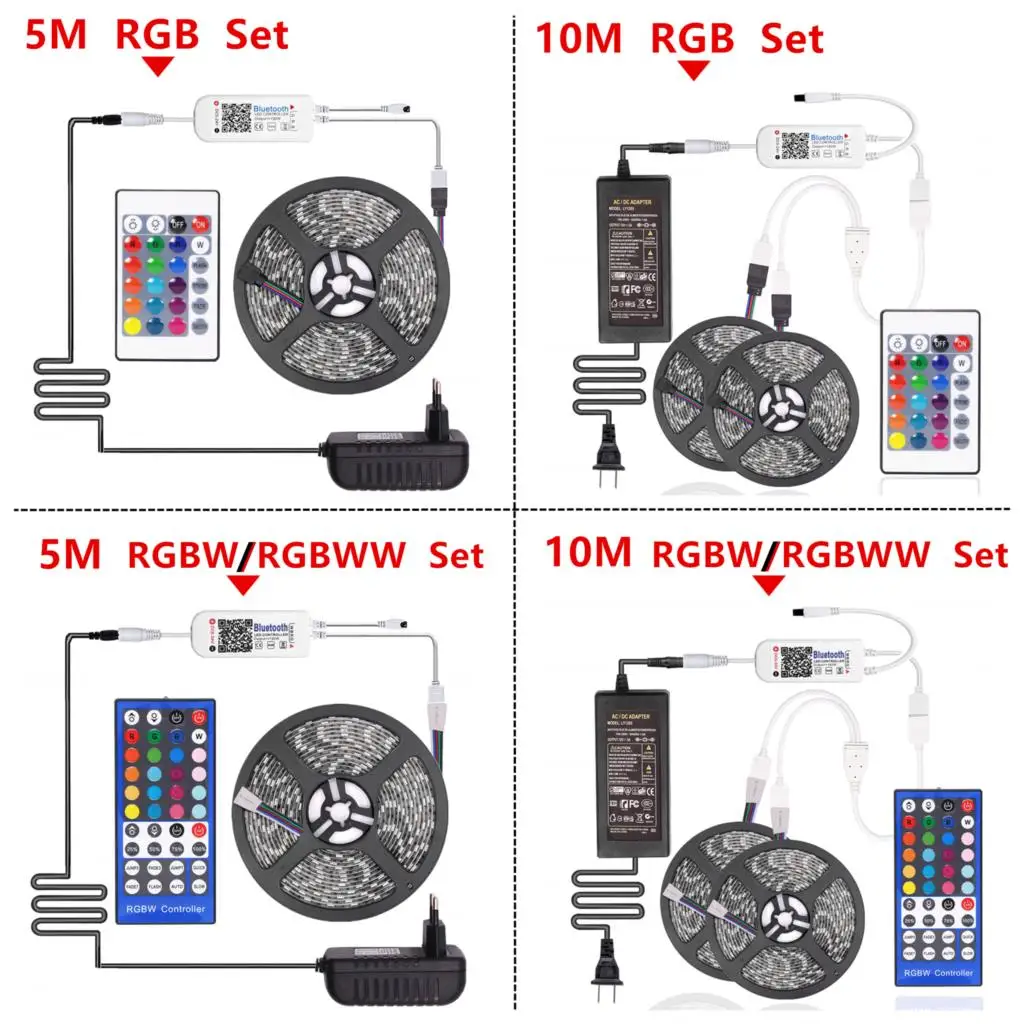 Если вы покупаете: 10 м RGBWW набор светодиодных лент, вы получите: 2*5 м RGBWW Светодиодная лента + 1 * RGBW Bluetooth контроллер + 1*1-2 провода + 1 * 5A источник питания (вилка отправляется в соответствии с вашим выбором покупки)