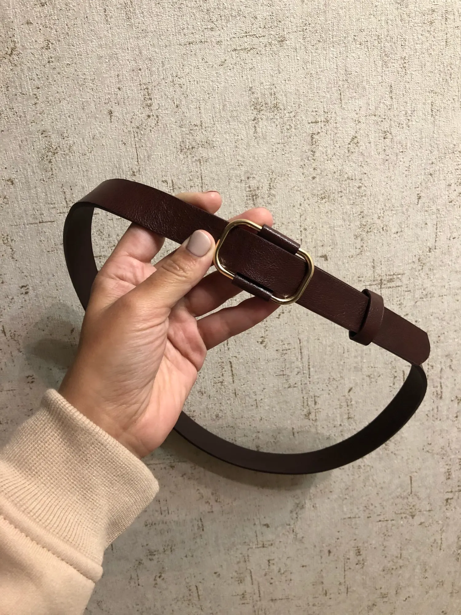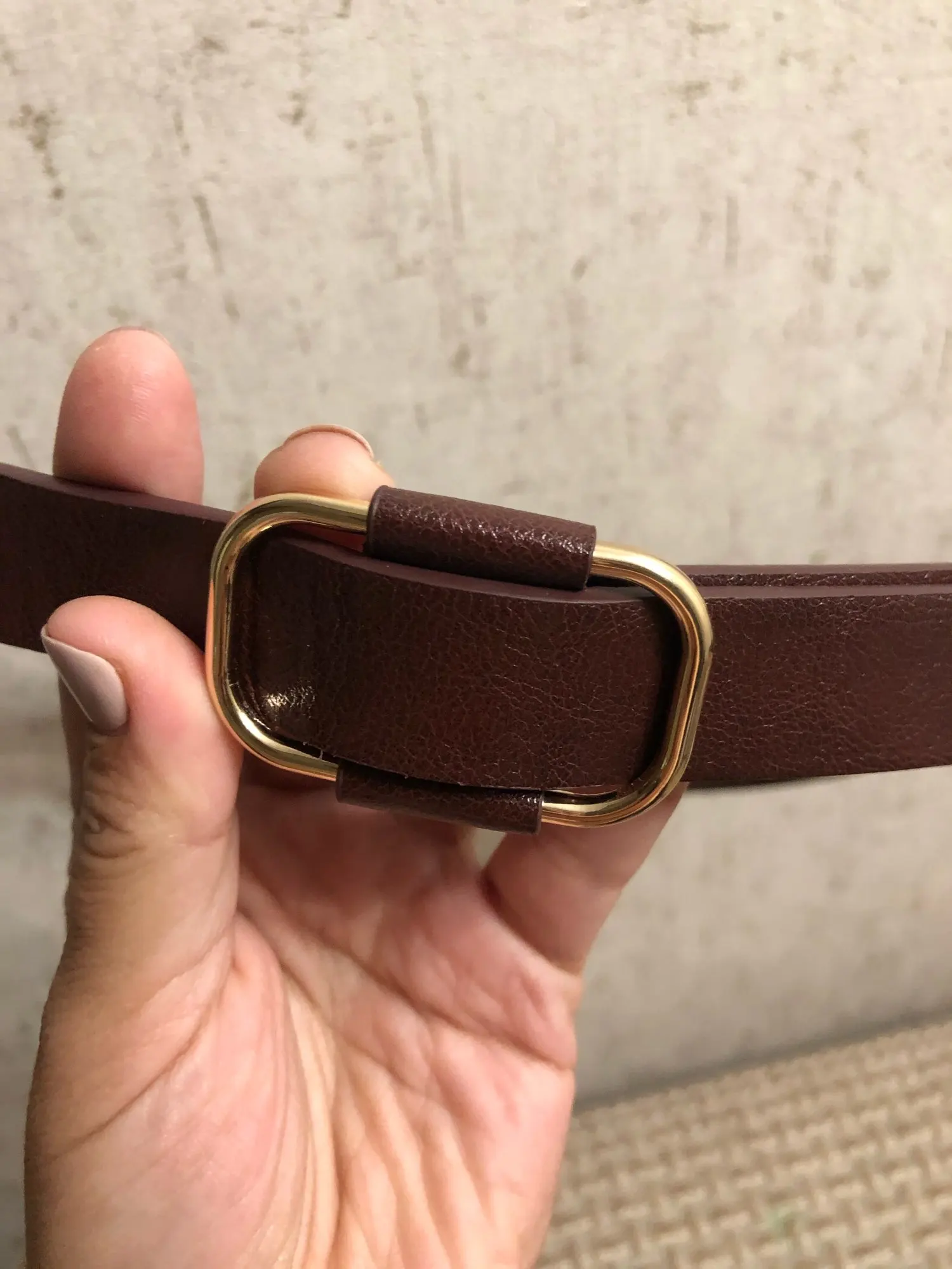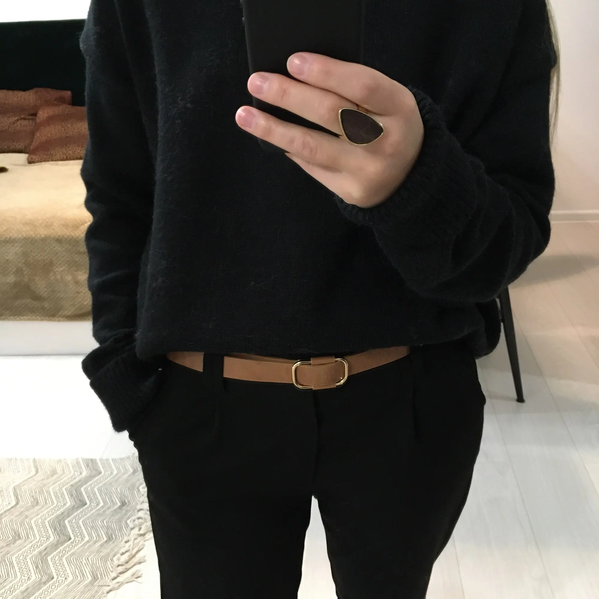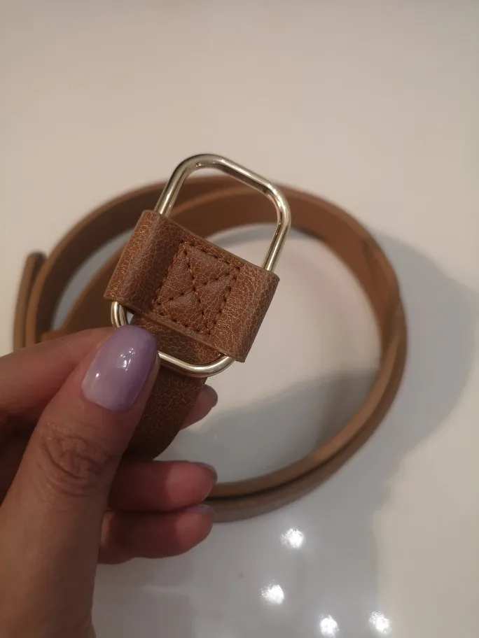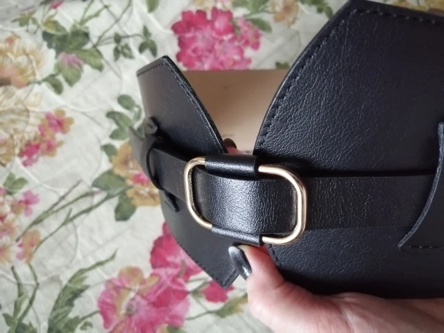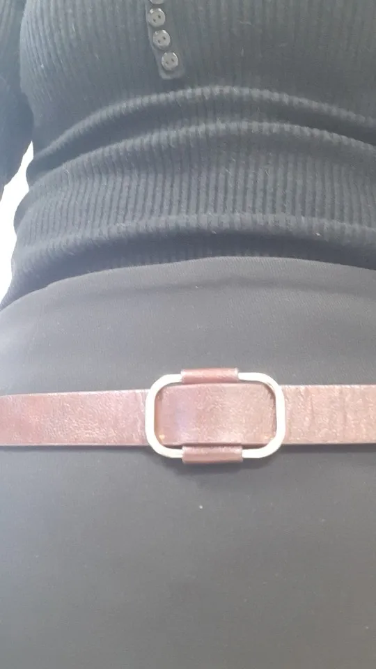 Ремень очень понравился. Пахнет кожей, но, скорей всего, если это и кожа, то прессованая. Цвет шикарный. Очень интересно выполнена застежка. Подойдёт ремень на любую талию. Ширина маленькая, лучше всего будет смотреться с юбкой или поверх свитера или блузы.