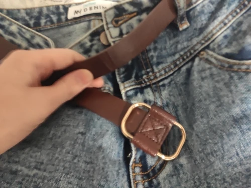 Ремень как на фото продавца. Джинсы держать не будет, отверстий нет, просто затягивается. Думаю при активной носке края ремня потрескаются. С продавцом не общалась