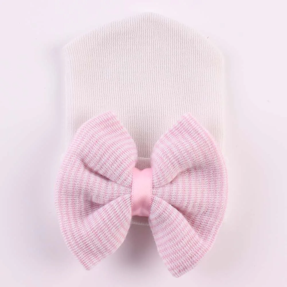 Детская шапка для младенцев, теплые шапки для малышей, хлопковые полосатые шапки, мягкие розовые, белые вязаные шапочки с бантом для новорожденных мальчиков и девочек 0-6 месяцев