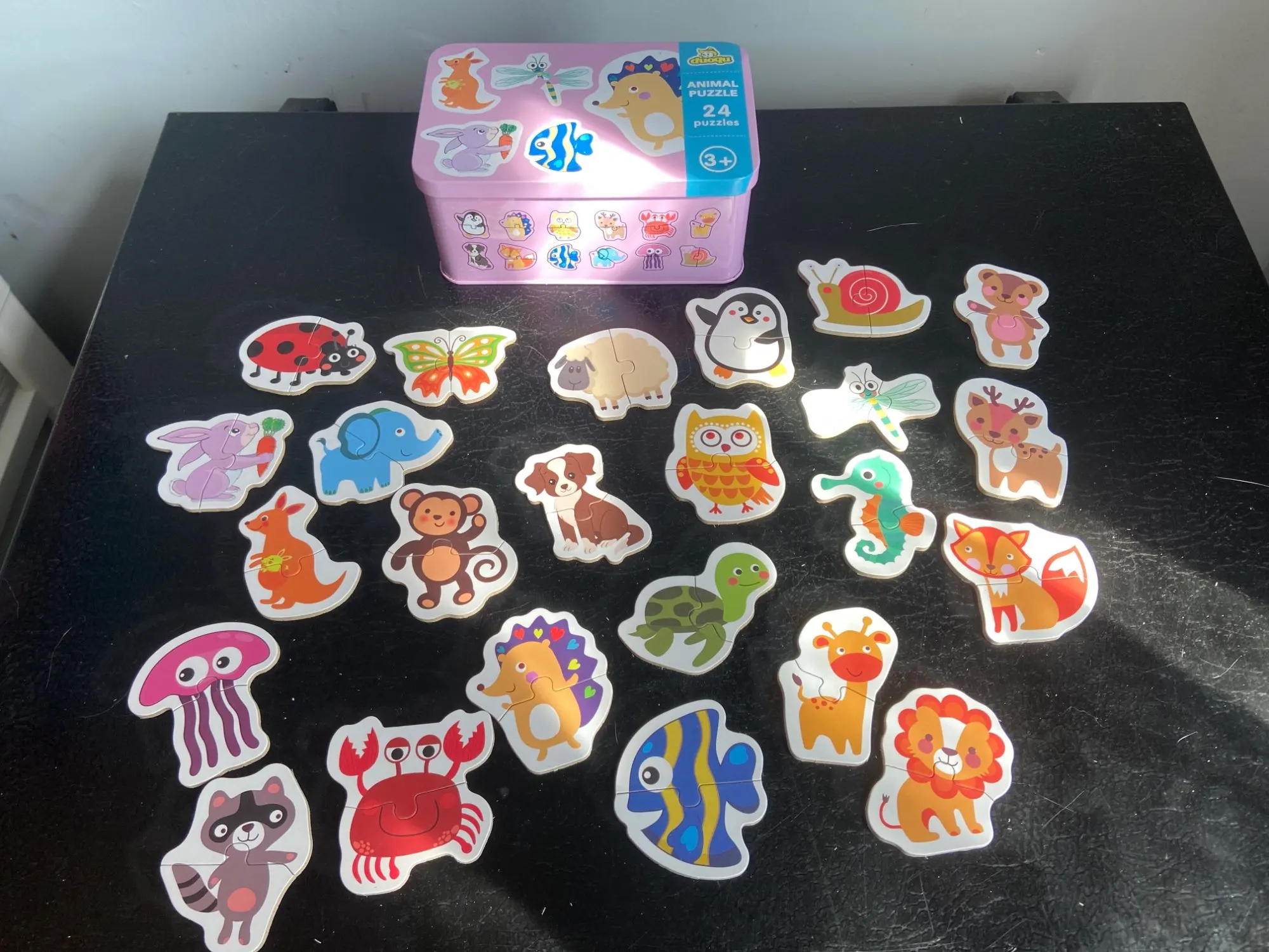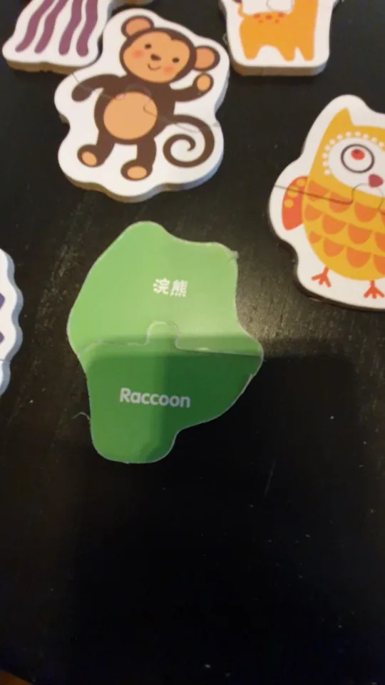 Very nice, cute, small puzzles. Easy for toddlers ro grab and puzzle them together. Pictures are nice, colorful. Good quality material. On the opposite side od puzzle is the name of animal in english and probably chinese. Definitely recommend the product.