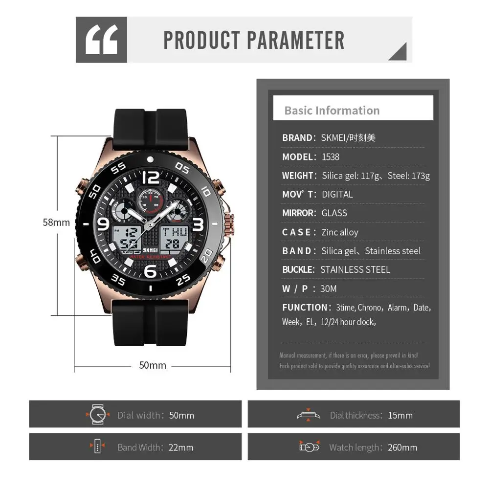 SKMEI Mens Watches Digital 3Time Wristwatches For Men Waterproof 12/24Hour Alarm Clock Chrono Men Watch relogio masculino 1538
