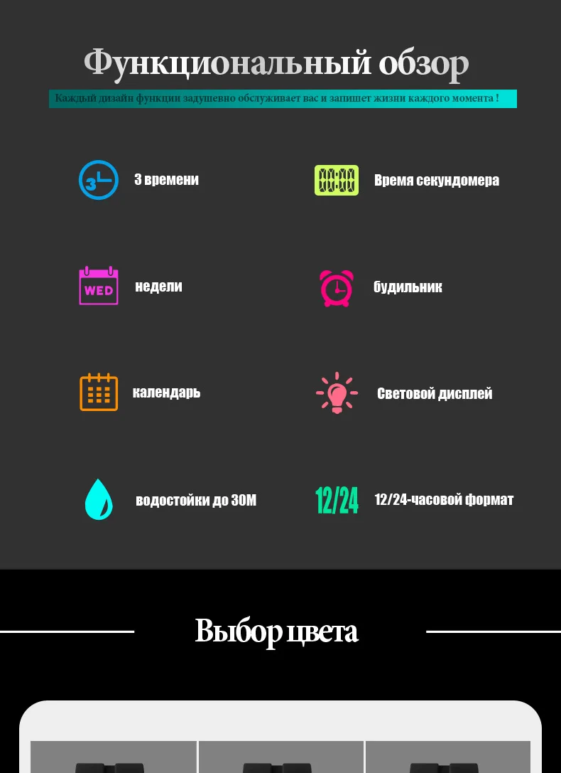 8.Function:3time, chrono,alarm,week,date,EL,12/24 hour clock