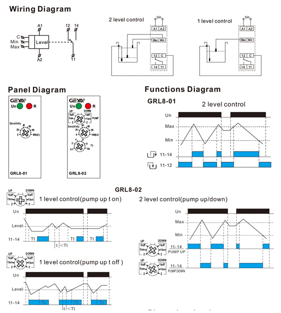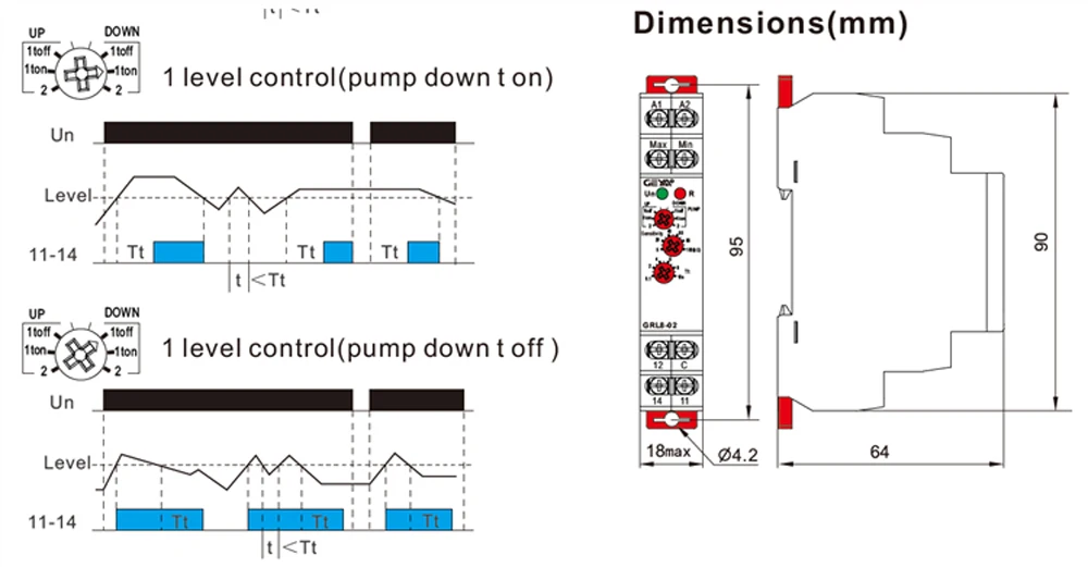 Название продукта Уровень Управление реле GRL8-01 2 уровня управления режимом (регулировка чувствительности) GRL8-02 2 или 1 режим управления уровнем (насос вверх/вниз) Функция Контроллер водяного насоса Напряжение диапазон Переменного тока/DC24V-240V Выход 1 SPDT Поставка терминалы A1-A2 Поставка Напряжение толерантность -15% + 10% Установка времени Potentionmeter Поставка индикация Зеленый светодиодный Выход индикация Красный светодиодный Номинальная частота 50/60HZ Номинальный ток 16A/AC1 Степень защиты IP40 для передней панели/IP20 для терминалов Вес/за штуку Бесплатная доставка 0,1 кг/шт. Стандартный EN 61812-1,IEC60947-5-1 Сертификаты Европейским сертификатом соответствия сертификатом от сертификационной организации CCC ассоциацией по техническому надзору (TUV) Гарантия/Гарантия 18 месяцев Минимальная партия 1 шт.