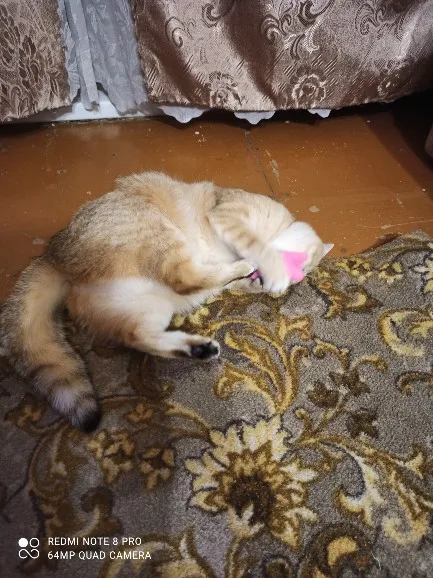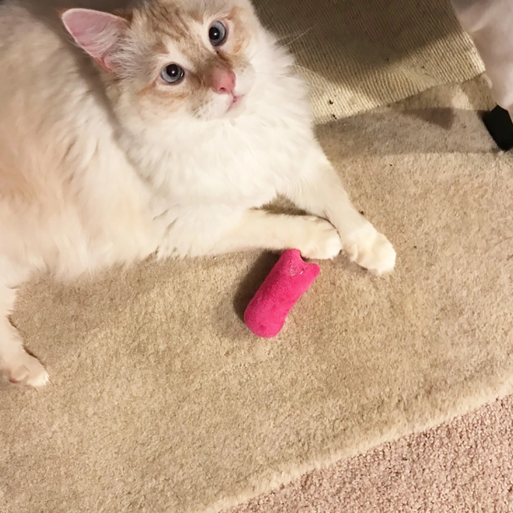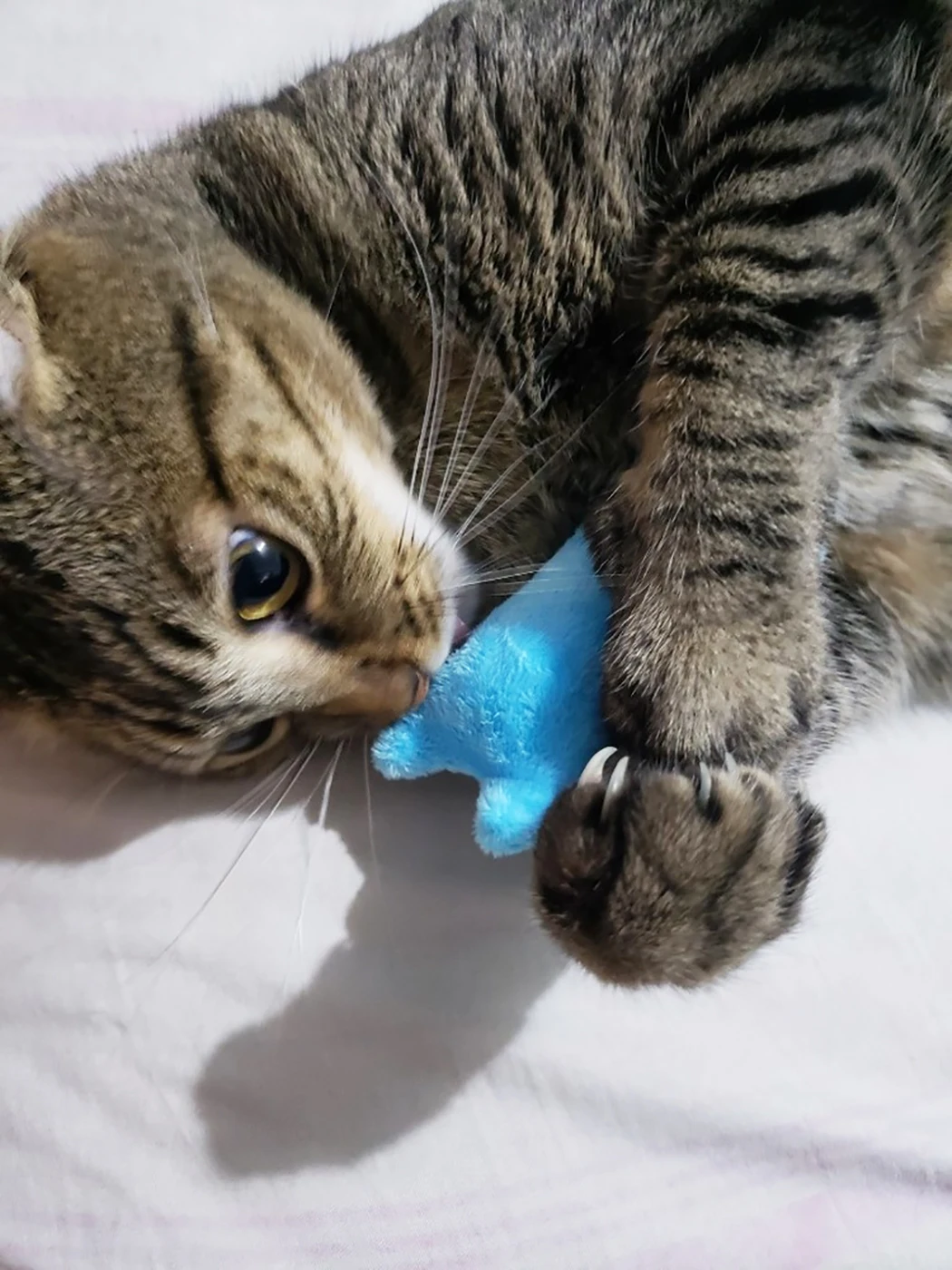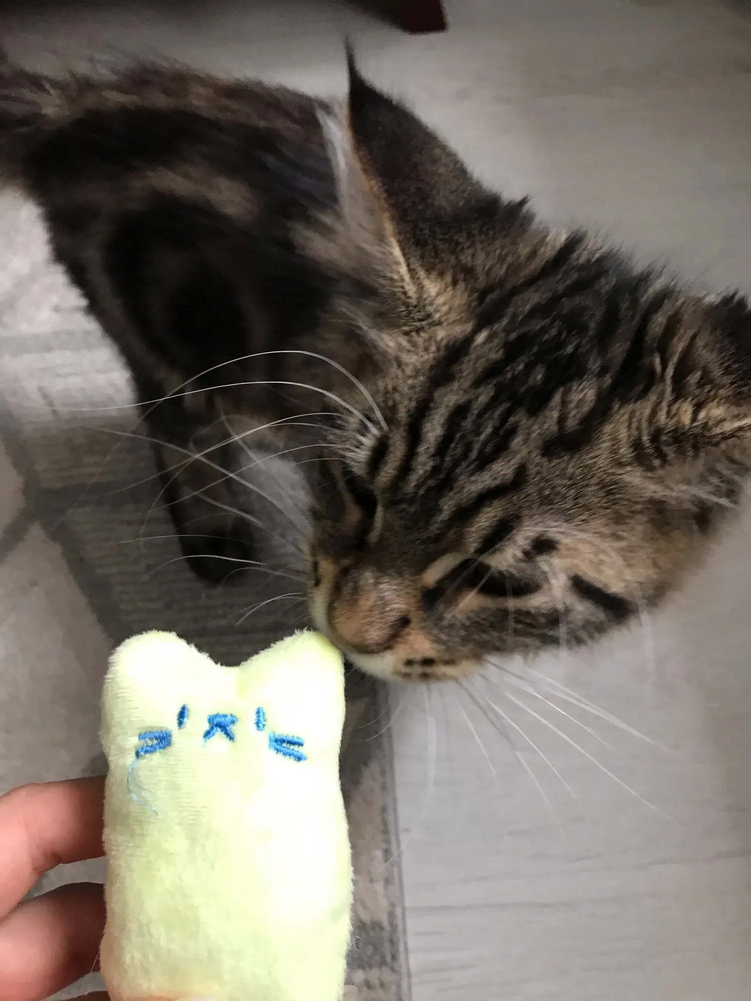Кошак просто в восторге. Катается с ним в обнимку по полу, лижет, кусает, трется об игрушку