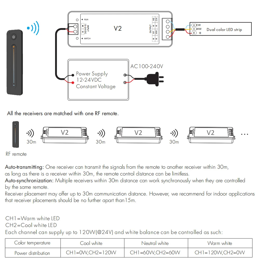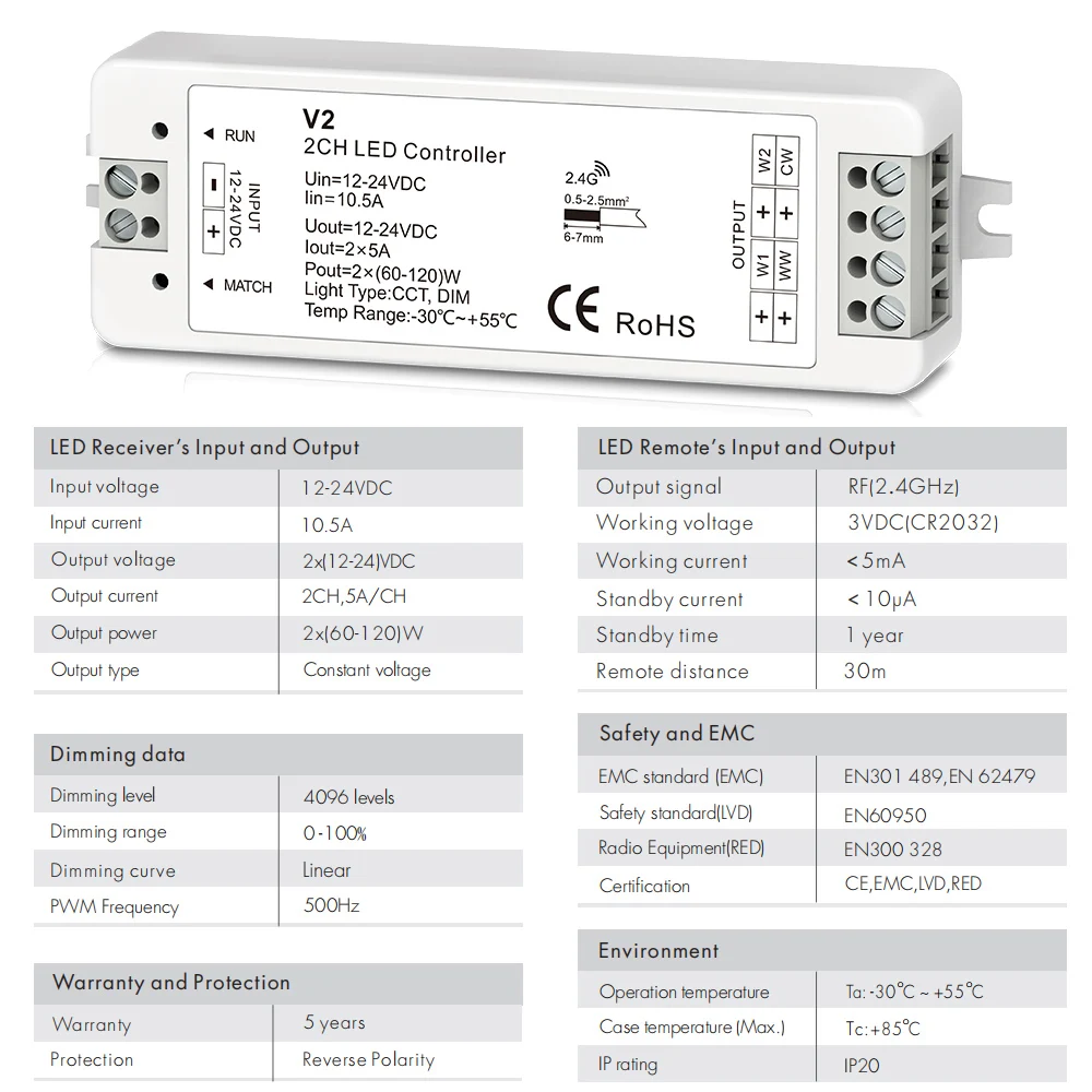Регулятор ярсветодиодный светодиодных лент WW CW, 2 канала, 12 В, 24 В постоянного тока, 10 А, 2,4 ГГц