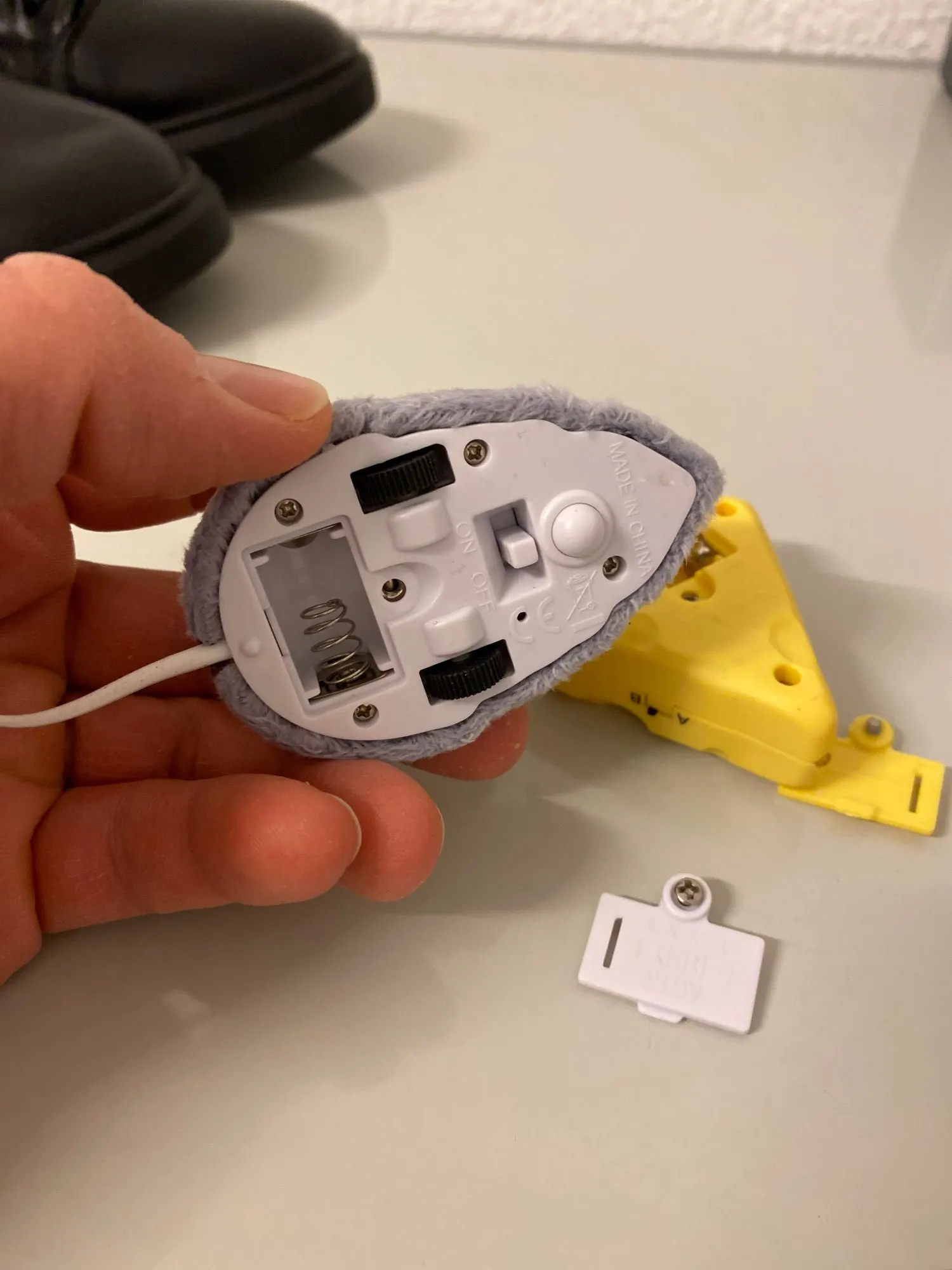 Прикольная игрушка , кота заинтересовала, но у нее есть 3 минуса: 1) Как все говорят, 3 батарейки AG13/LR44 не хватает даже на пол часа, по факту минут 10-15. Есть несколько свободных АКБ 3.7 В небольшой ёмкости и зарядное на 3.7 В, буду ставить в свободное место корпуса мышки(он из эпоксидки кстати) 2) Очень плохая конструкция мыши изнутри- то что мышку начинает уводить в сторону вина именно конструкции пластиковых шестеренок на соплях. Самое забавное, что сделать ее лучше можно было бы лишь продлив ось колеса и сделав ее полностью опорной. 3) Какой бы идеальной поверхность не была, мышь собирает на себя волосы и кучу другой пыли, которая застревает в осях колес