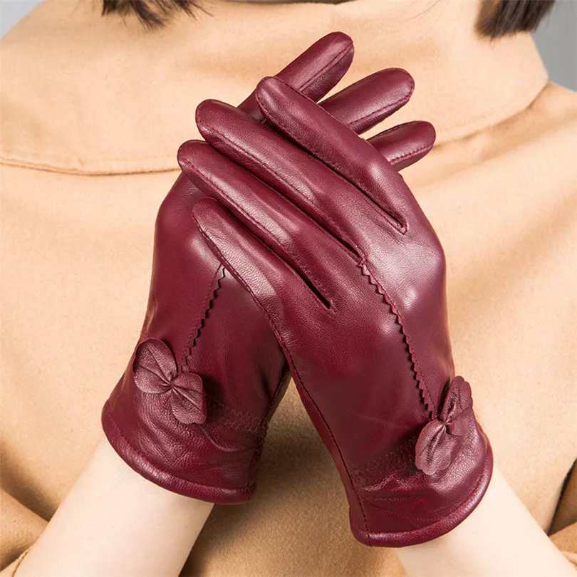 Зимние варежки, женские перчатки, перчатки, сохраняющие тепло варежки, кожаные варежки для женщин, овечья кожа, с бантом, дизайнерские женские варежки, электрические черные перчатки