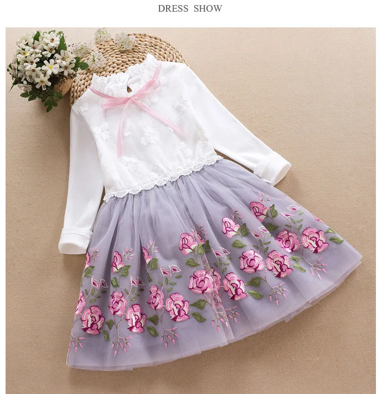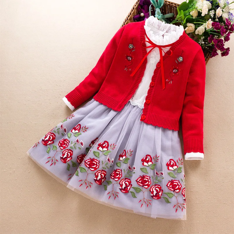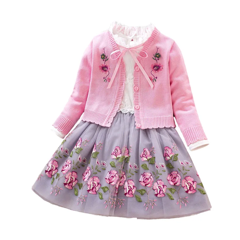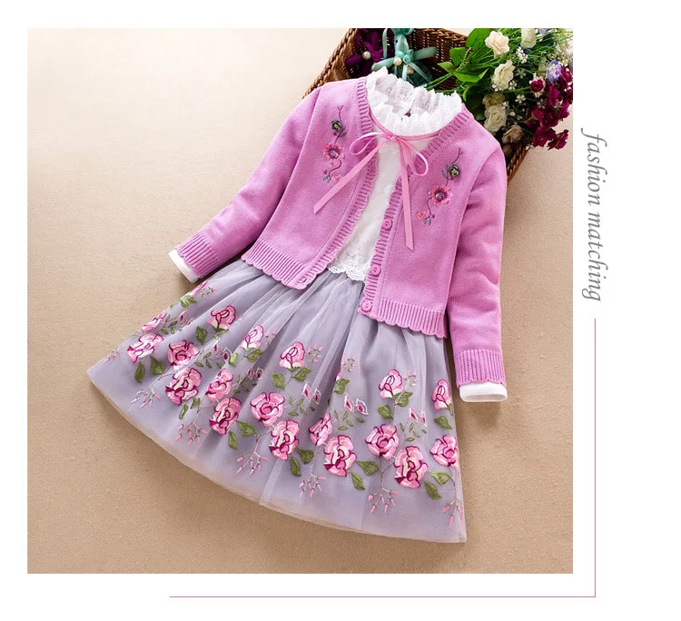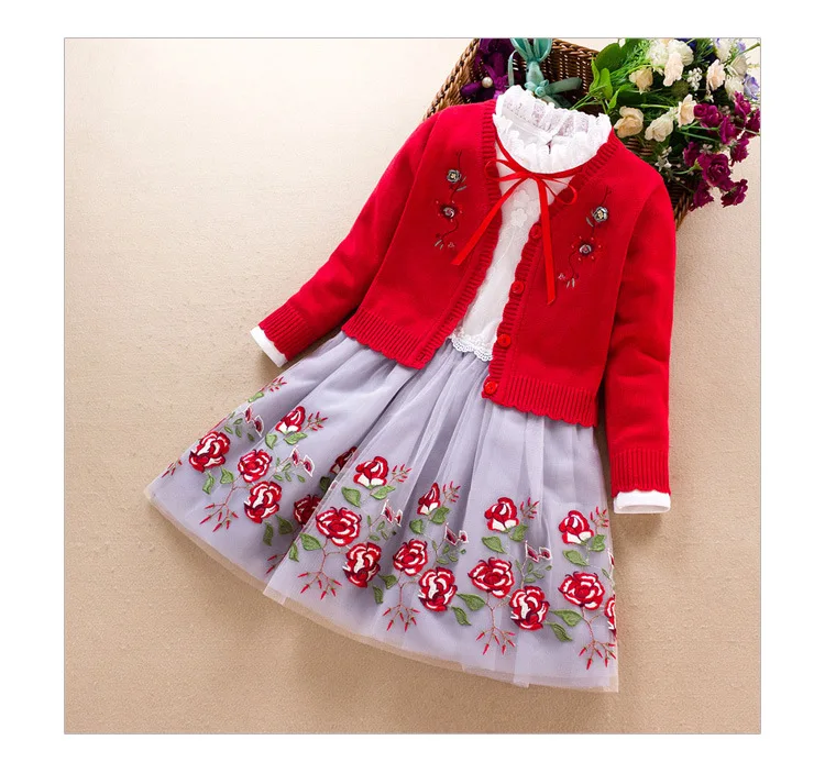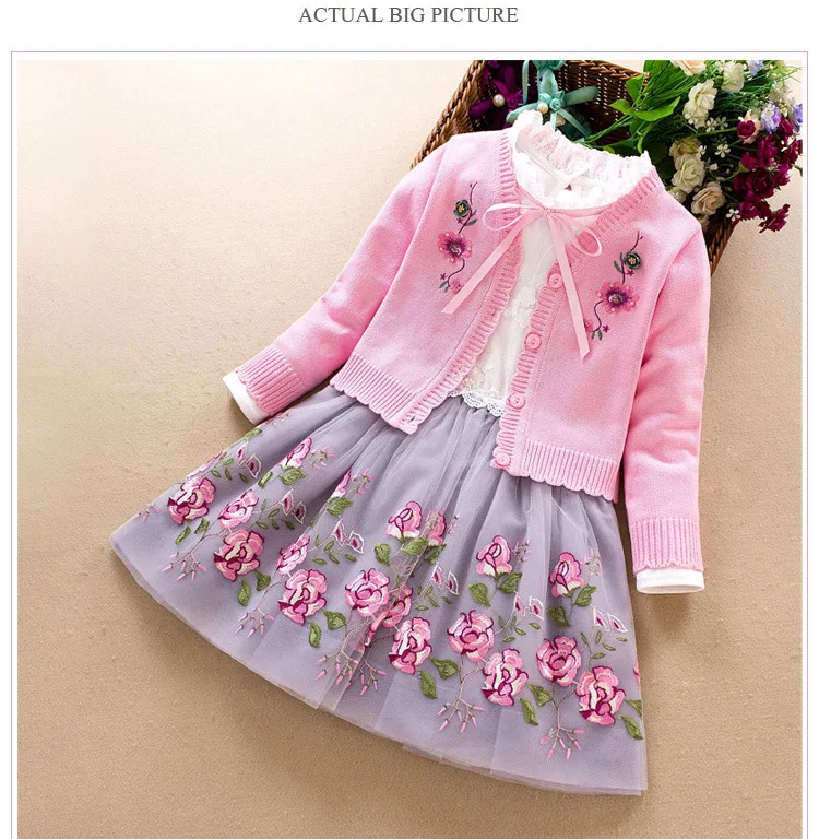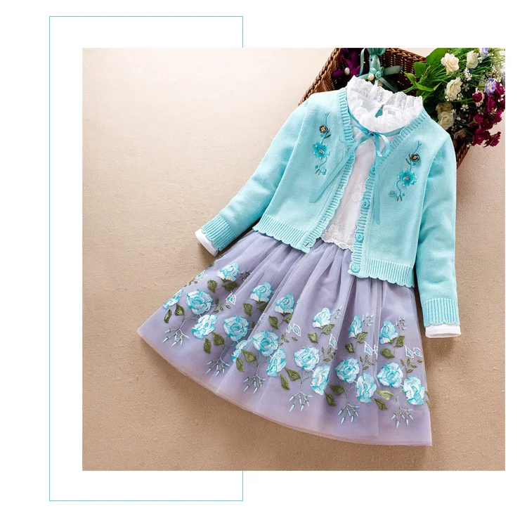 Детский комплект одежды для девочек, Осень-зима-весна, хлопковый свитер с длинными рукавами + платье, костюмы из 2 предметов, одежда для детей 3-9 лет
