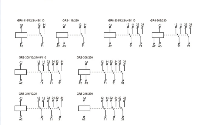 ■Applications -Промежуточное реле, используемое для переключения более крупного выхода нагрузки, укрепления или многосективных контактов имеющегося устройства. ■Function Особенности -Диапазон напряжения: переменный ток/постоянный ток, 24 В, 48 В, 110 В, переменный ток 230 В -Реле GR8-316 возможность подключения к 3 фазы цепи. -Состояние реле отображается светодиодный. -1 модуль, монтаж на din-рейку. ■■Model и данная фраза описывает Номинальное напряжение питания контроля: 12: переменный/постоянный ток, 12 В 24: переменный/постоянный ток 24 В 48:AC/DC 48 В 110: переменный/постоянный ток 110 В 230:AC230V Количество контактов: 116:1 ×spdt 16A