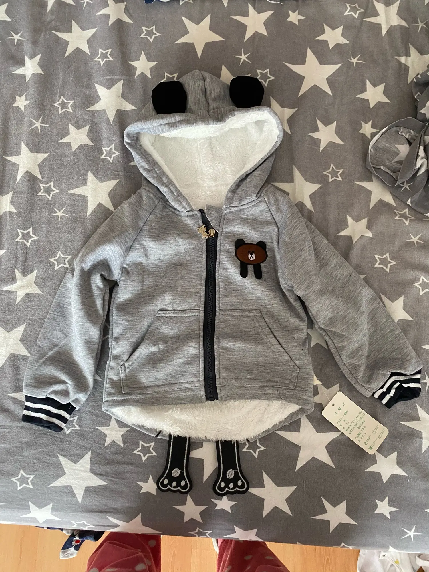 Через 1 неделю он прибыл, очень быстро! Выглядит тепло с внутренней текстурой. Моему сыну почти 11 месяцев и он все еще большой, но потому что он носит одежду 70 см. Но через несколько месяцев я думаю, что идеально