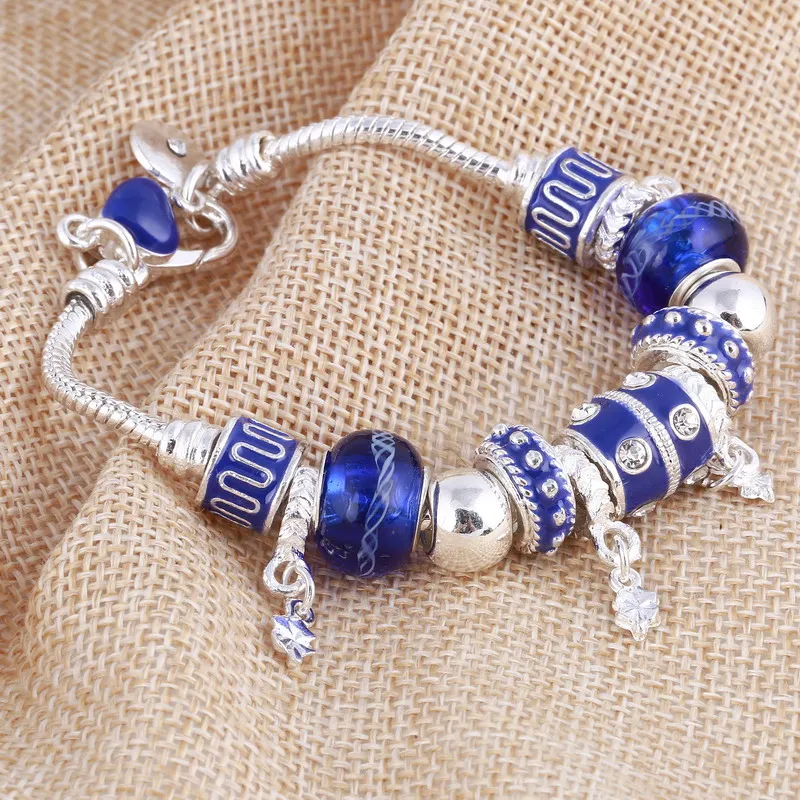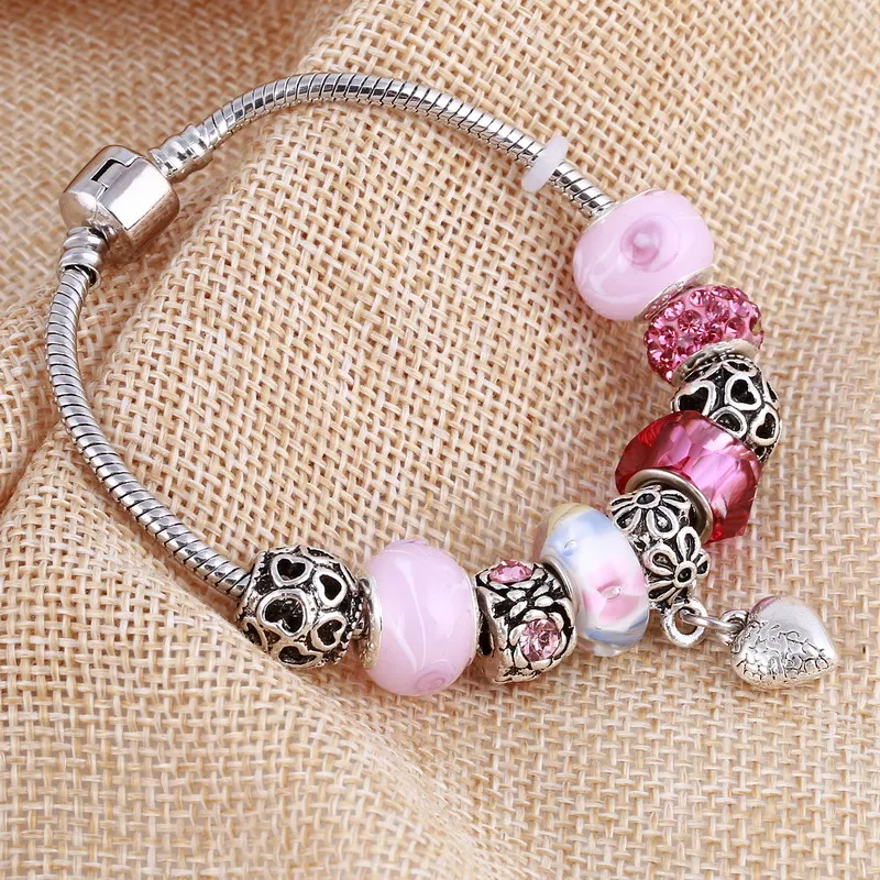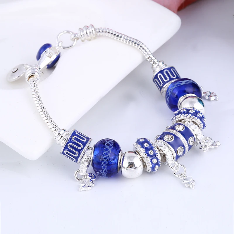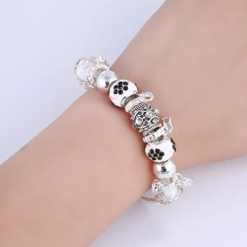 Женский браслет с бусинами и кристаллами, серебристого цвета
