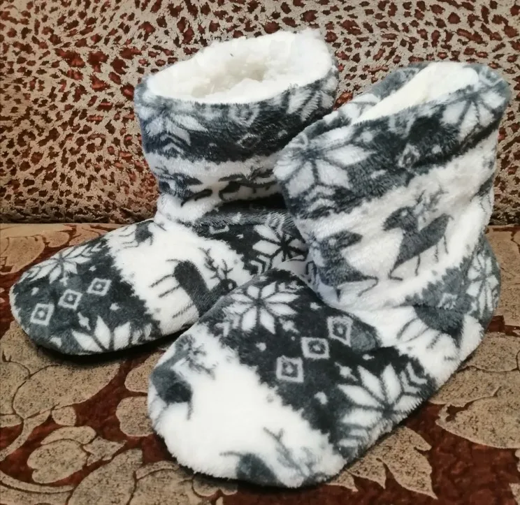 Тапки - огонь! Удобная (но немного скользкая на паркете подошва, не смотря на пупырышки). Нежнейшие, супер теплые. Ходить в них - одно удовольствие. Голенище достаточно высокое - опять же создает эффект обогрева. Визуально выглядит хорошо (немного есть ощущение, что я в них как хоббит)))