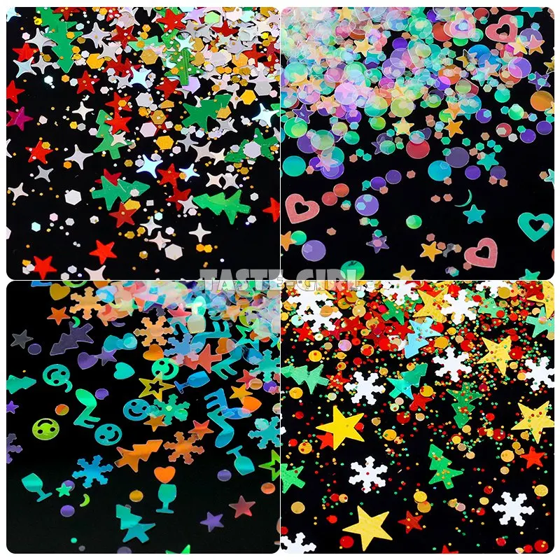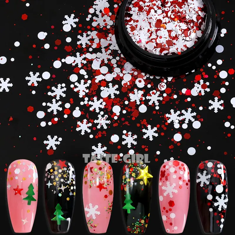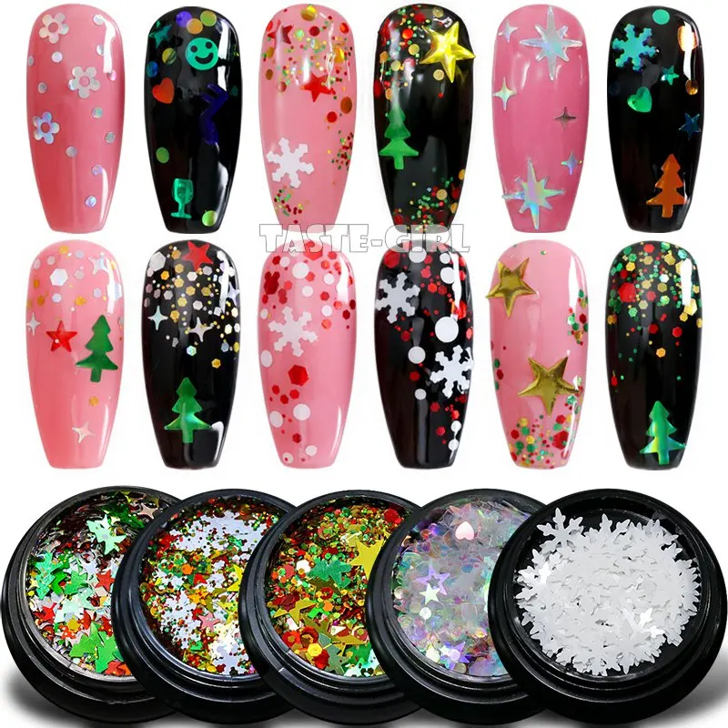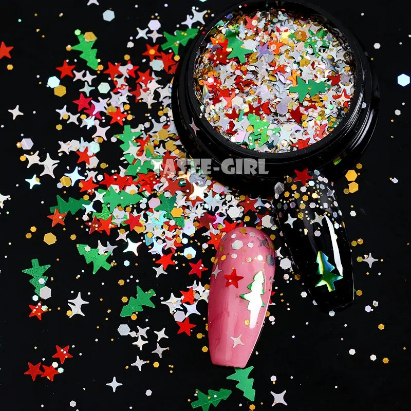 1 баночка для ногтей, блестящая микс-форма, Рождественская елка, снежинка, звезды, голографические пайетки, наклейки в виде кусочков ногтей, украшения для маникюра