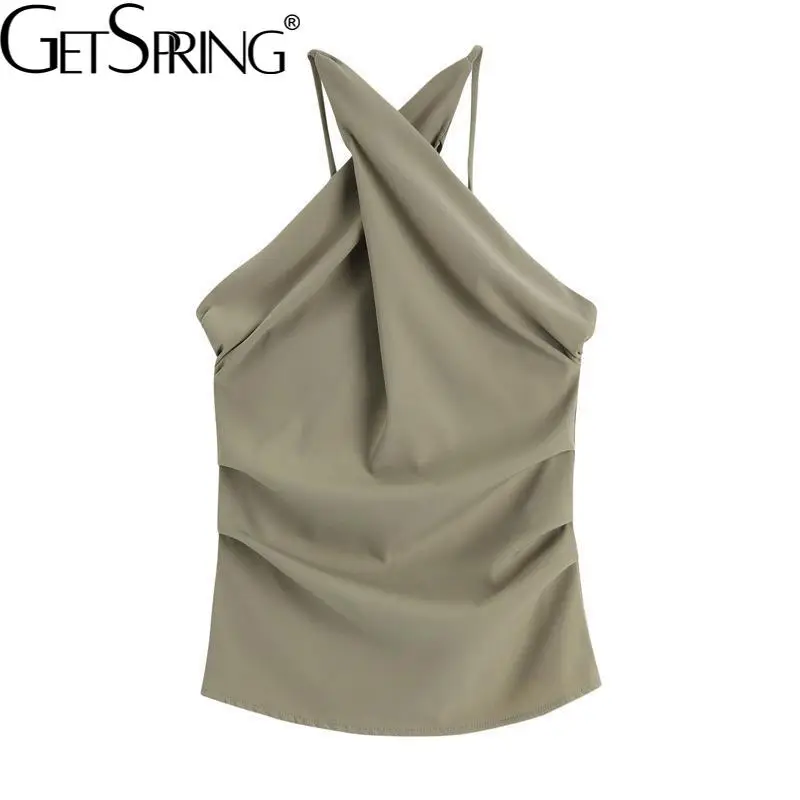 GetSpring Женский укороченный топ, перекрестный, без рукавов с открытыми плечами, привлекательные короткие топы, черный, зеленый цвет, универсальный летний топ для женщин, новинка 2019 г.