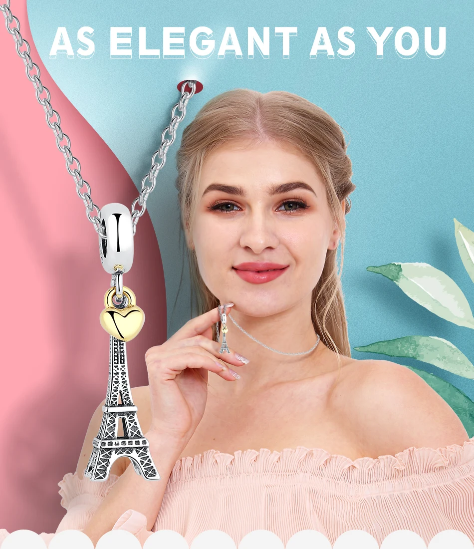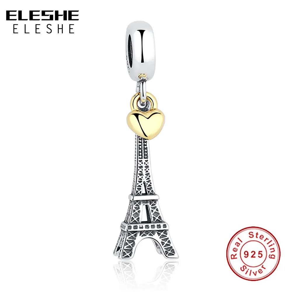 Чистый бусины из стерлингового серебра 925 Париж Эйфелева башня и Золотая подвеска в виде сердца шарма Серебро 925 браслет, сделай сам, ювелирное изделие