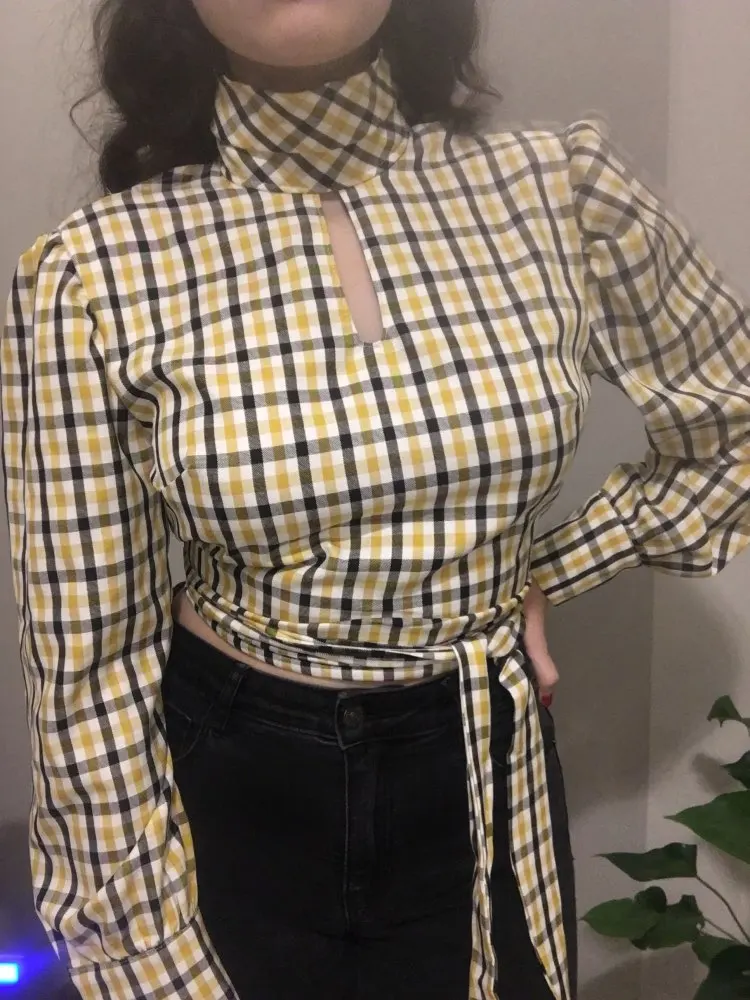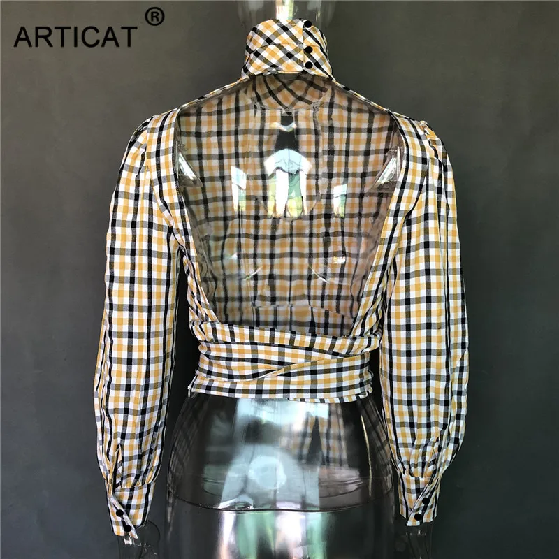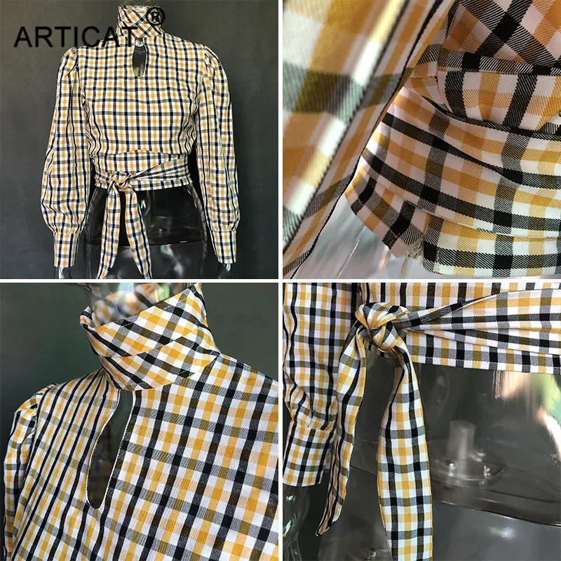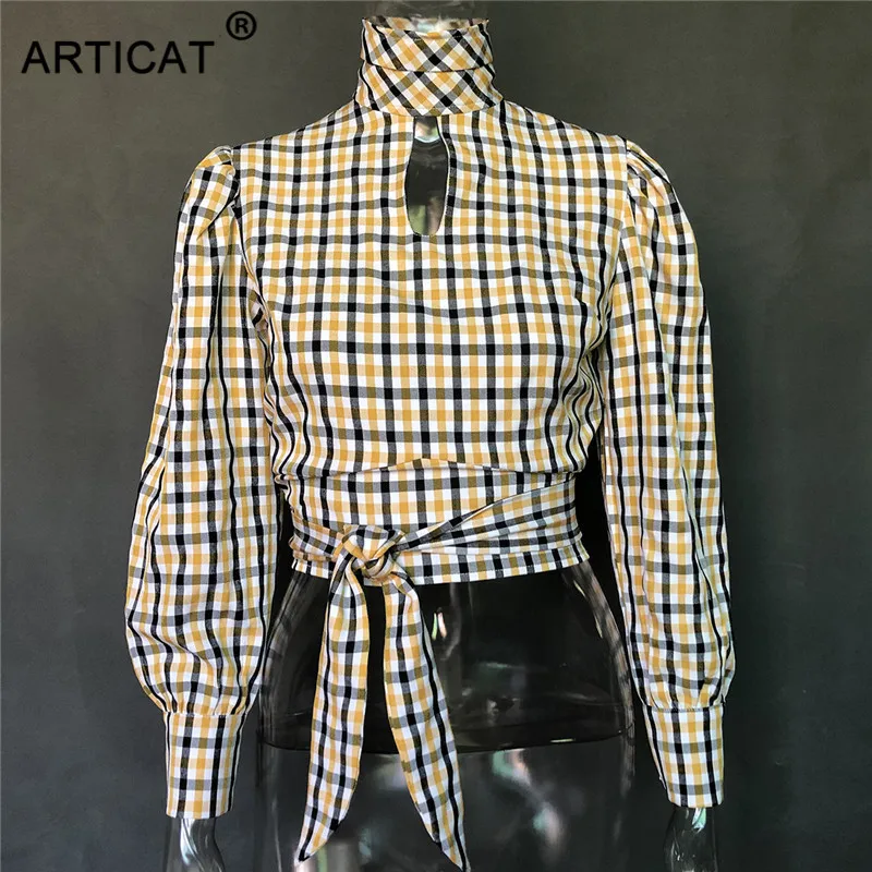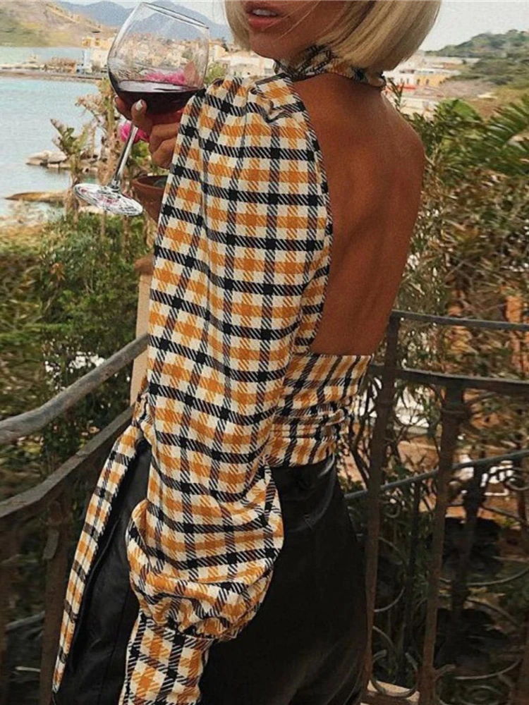 Блузка женская в клетку Articat, с открытой спиной, воротником-хомутом и длинными рукавами, на шнуровке, на лето