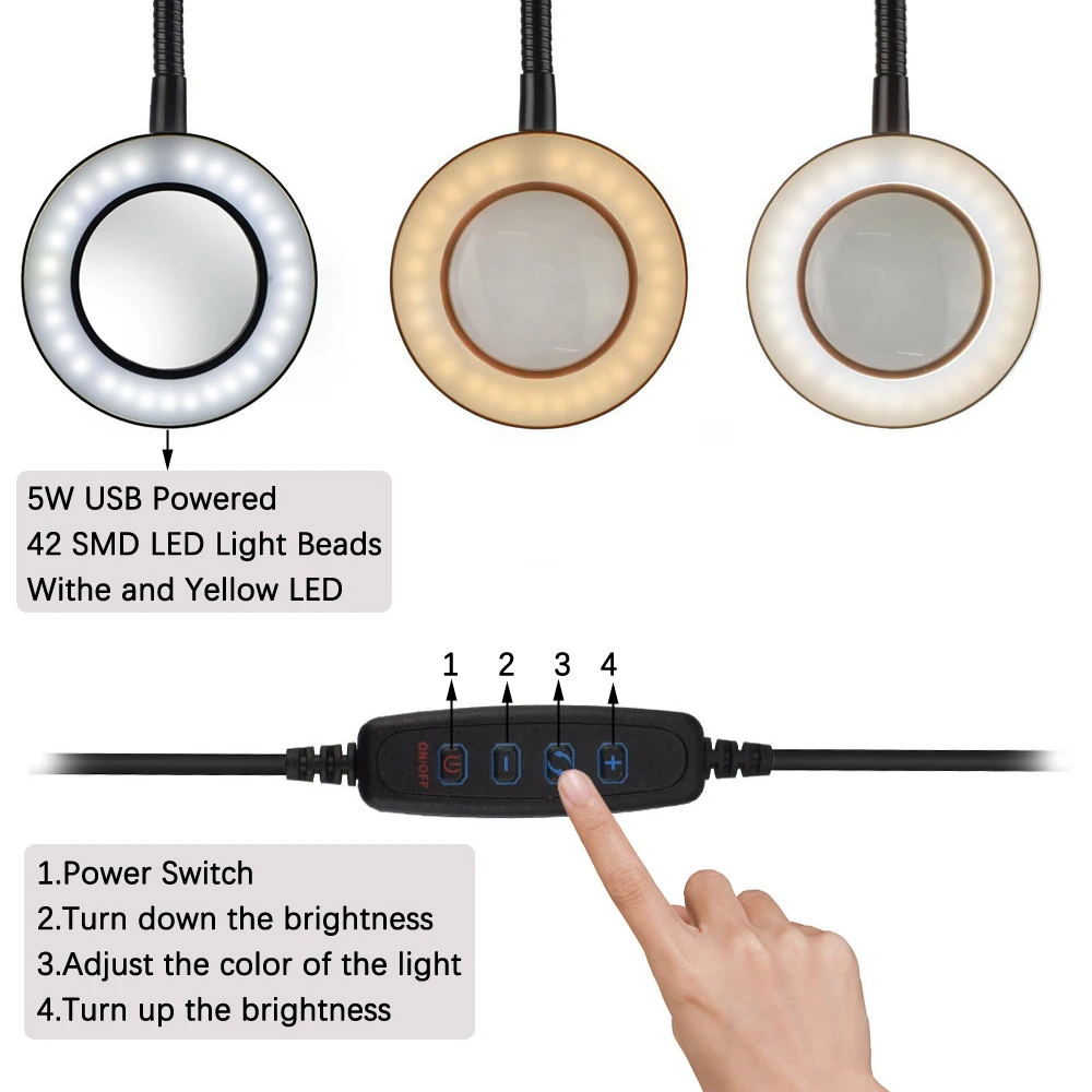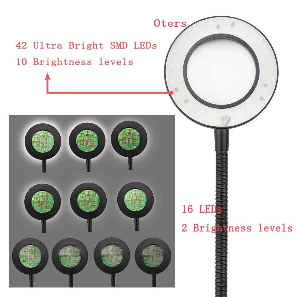 Описанию соответствует. Товаром доволен. Для работы с небольшими платами и т. п. подходит прекрасно. Свет достаточно яркий. Переключается - теплый, холодный и смешанный. Вполне устойчив, веса основания хватает. Линза имеет скол с самого края и болтается... На работу не влияет. Рекомендую.