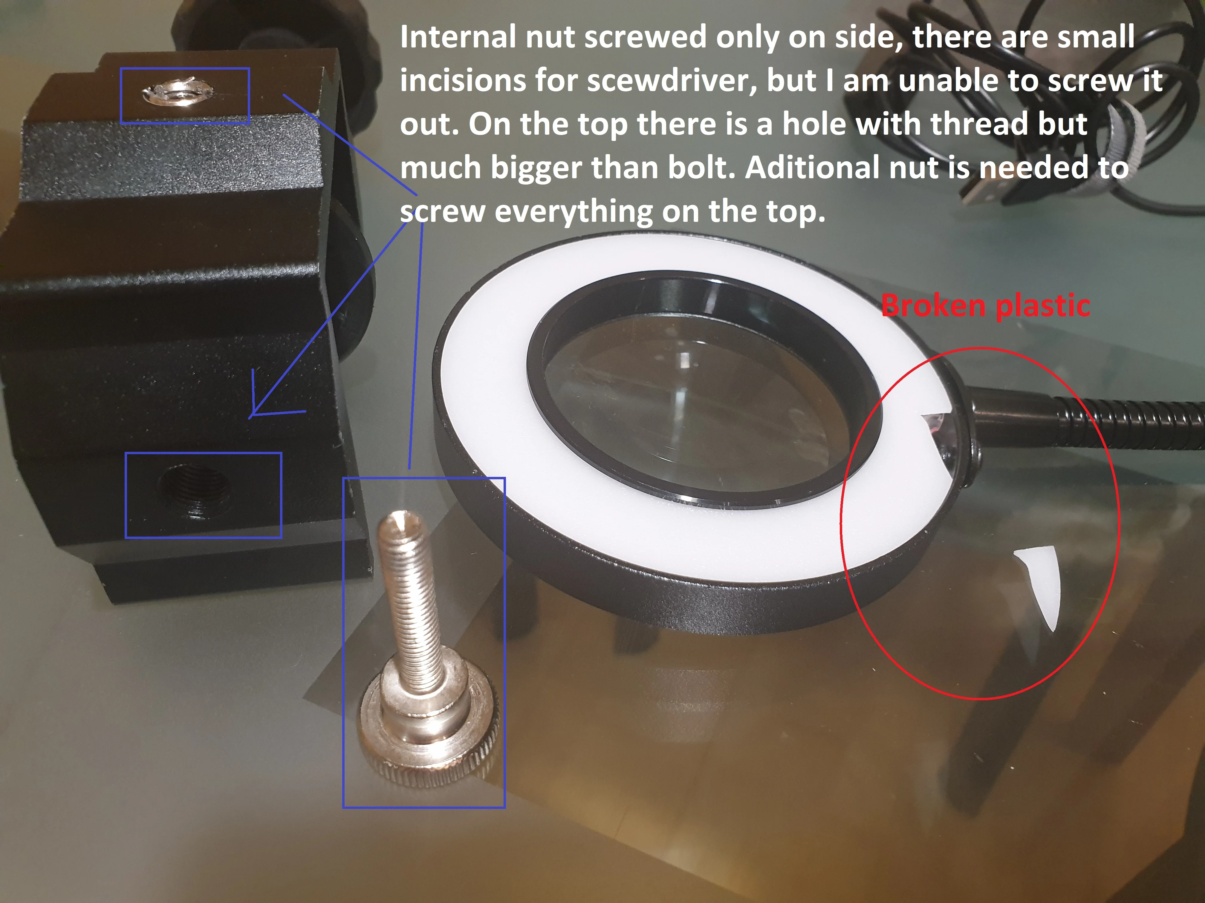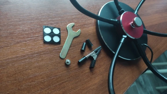 Доставка оставляет желать лучшего отправили - 31.12, пришло 5.03. Своих денег стоит, в комплекте 4 резиновые ножки наклеиваются на станину. 6 крокодилов(один запасной), две пластиковые шайбы между станиной / базой / болтом. Увеличительно стекло(3х) с подсветкой 10 яркостей по 3 температуры.