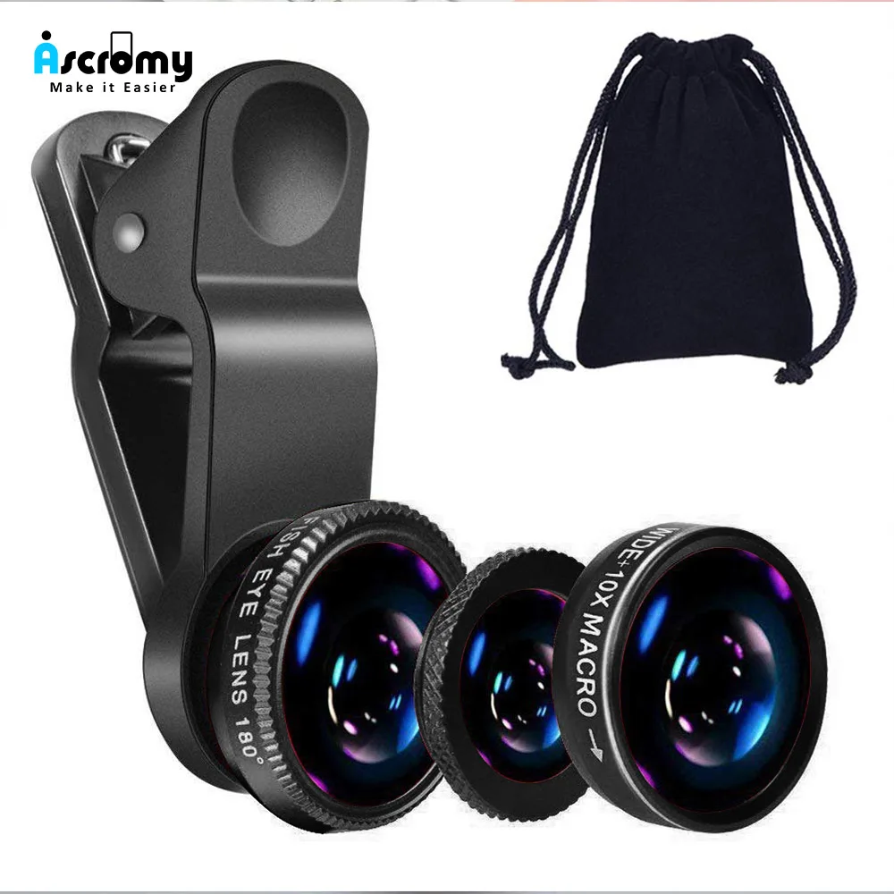 Универсальные широкоугольные объективы Ascromy 3 в 1, объектив для камеры сотового телефона, объектив рыбий глаз, зум, телеобъектив, набор для смартфонов Samsung, Huawei P30