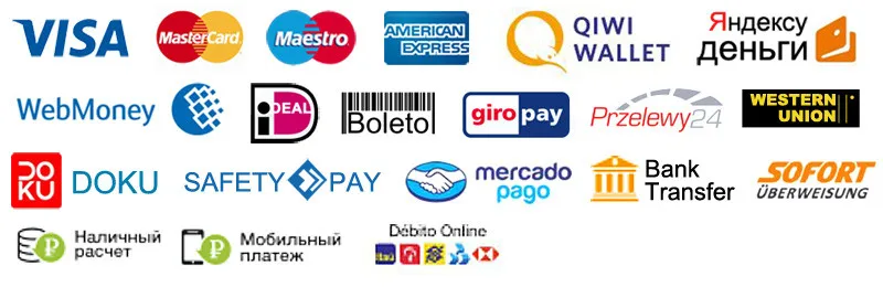 Visa,MasterCard,Maestro,American Express,Qiwi Wallet,WebMoney,Giropay,Przelewy24,Western Union,Doku,Safety Pay,
