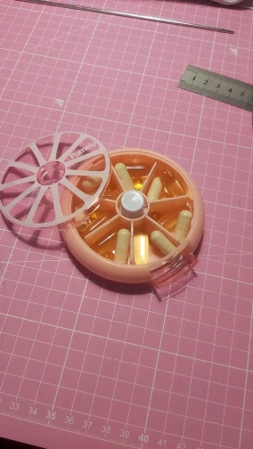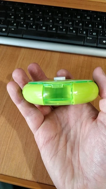 Хорошая штука для небольших таблеток, а если много капсулы, то 3-4 только поместятся в день. Нет маркировки ячеек по дням . Маркером можно нанести дни недели, но учитывайте куда вращаются ячейки при нажатии кнопки, по часовой стрелке.