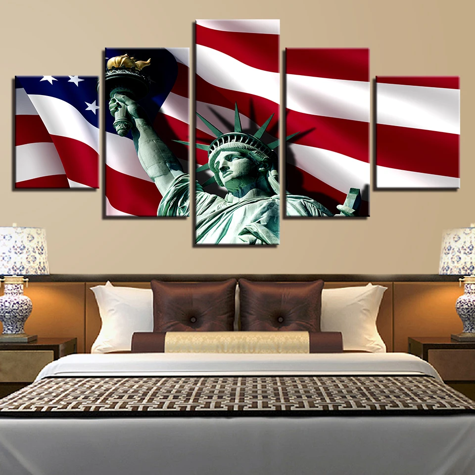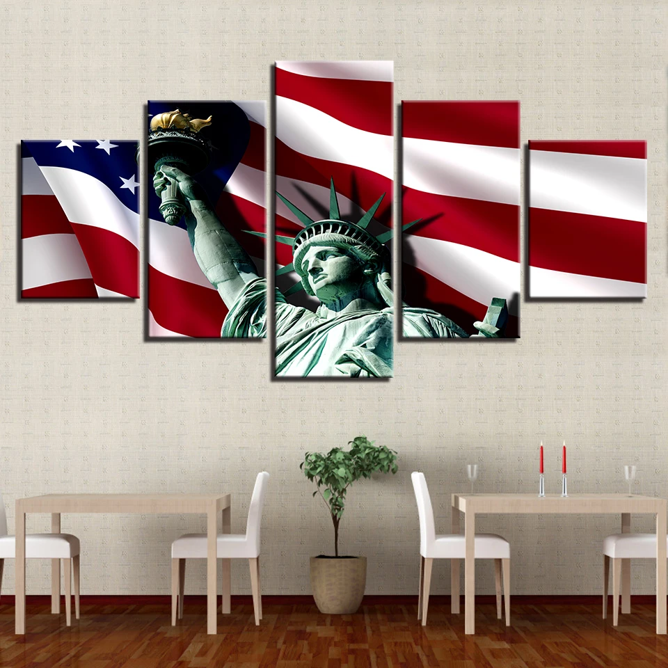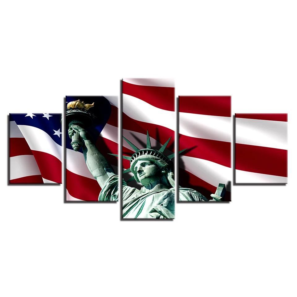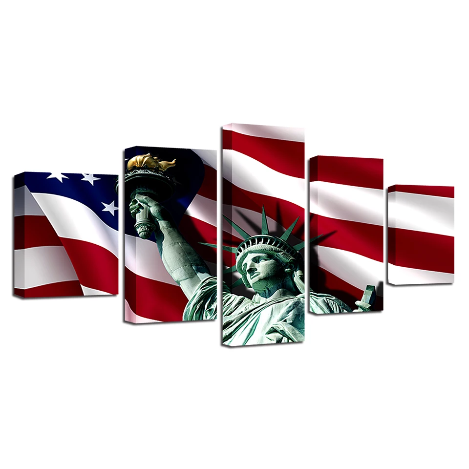 Печать на холсте HD, картина для гостиной, Настенный декор, 5 шт., статуя богини свободы с американским флагом, Модульная картина