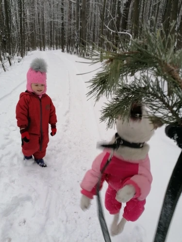 4 месяца девочка Французский бульдог, в притык, на эту зиму хорошо, на следующую уже будет мал. Доставка быстрая, спасибо