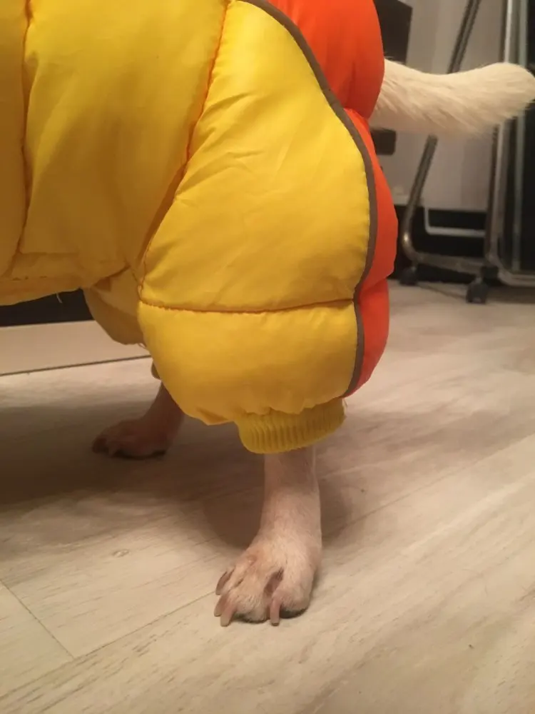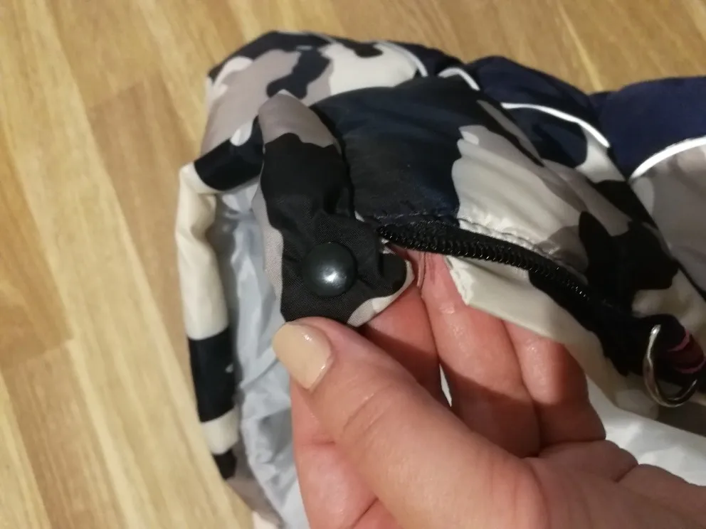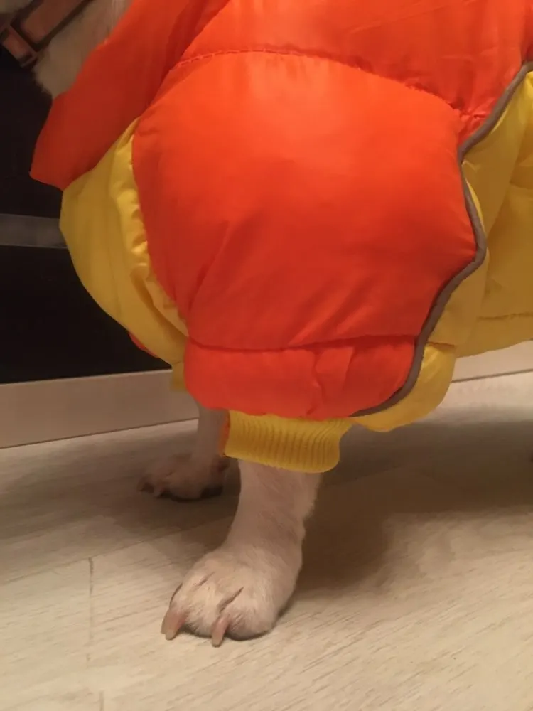 Комбез пришёл хорошего качества. Единственное, я взяла на размер больше чтобы перестраховаться. И в целом все подошло отлично, кроме длины рукавов. Или штанин)) что там у собак? можно было бесплатно обменять, но я и так ждала комбез месяц, вместо обещанных 2х недель, и не была готова ещё ждать столько же чтобы попытать удачу. Один раз я вышла с ней гулять как есть, но собака пару раз не запланировано ныряла мордой в сугроб, когда спотыкалась. Поэтому я взяла дело в свои руки и сделала из своей собаки хипстера с подворотами. Но ей такой стиль пришёлся не по душе, да и она стала напоминать надувного чувака из рекламы шин, поэтому я решила проявить креатив и перешить. Машинки у меня дома нет, поэтому делала вручную. На первой переделанной штанине полёт был нормальным, и я думала как шитьё расслабляет и что зря я прогуливала уроки труда. После третьей, я думала так и оставить: три коротких, а одну длинную, типа стиль. Но потом все же решила доделать. Спойлер: швеёй я оказалась не очень.