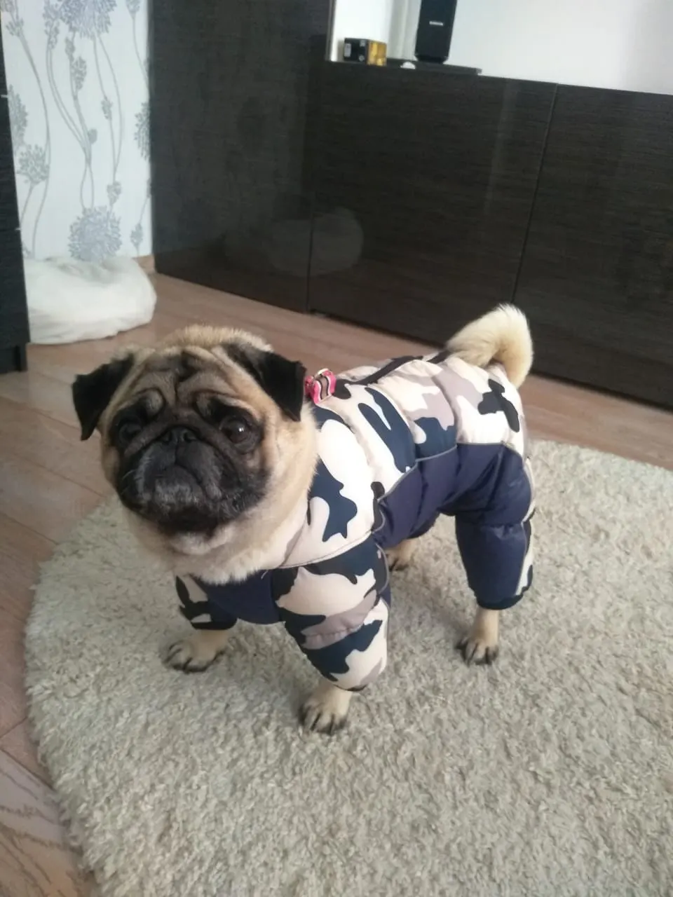 пришел комбез быстро. красивый, собака даже сама в него сразу влезла) только немного длинноват сзади, а так размер вроде подошёл. когда гуляли поворачивали рукава, а то лапы вовнутрь проваливаются. мопсик около 9 кг.
