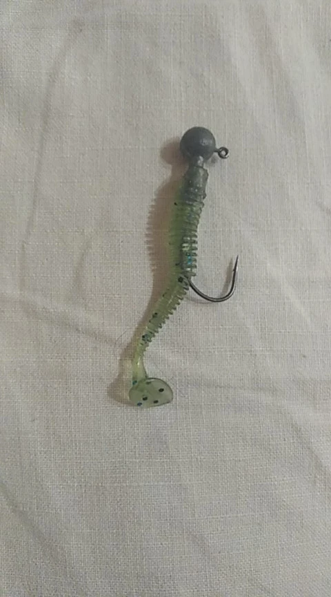 Пришла за 2 недели в Киев. Приманка полностью соотвествует описанию. Болотного цвета с редкими черными точками, очень мягкая и поддатливая. На рыбалку не ходил но по ощущениям ловить будет очень хорошо. Всем советую!