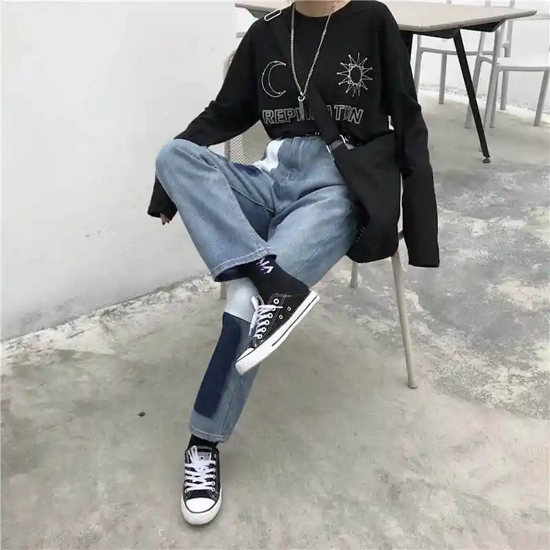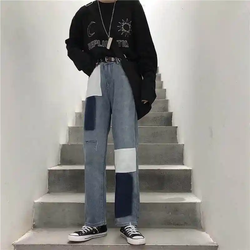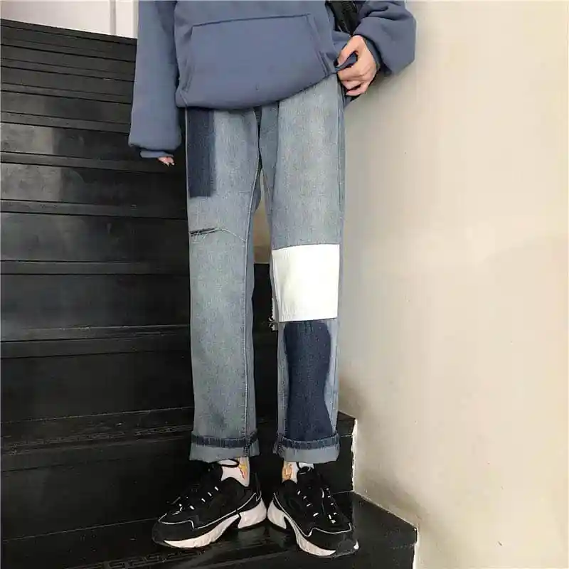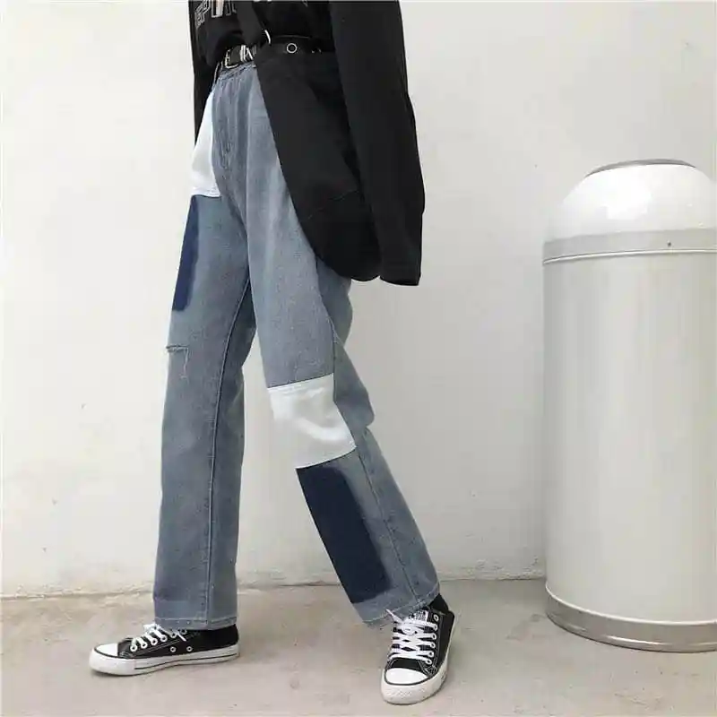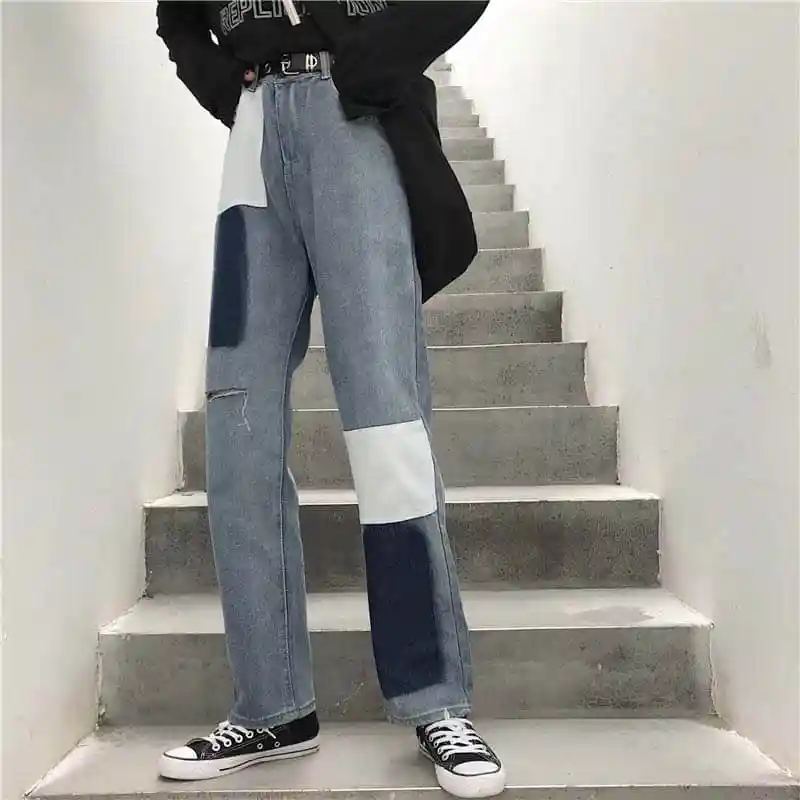 NiceMix 2020 уличная одежда пэчворк контрастные блочные прямые джинсы женские винтажные джинсовые брюки с высокой талией дырками рваные однотонные брюки