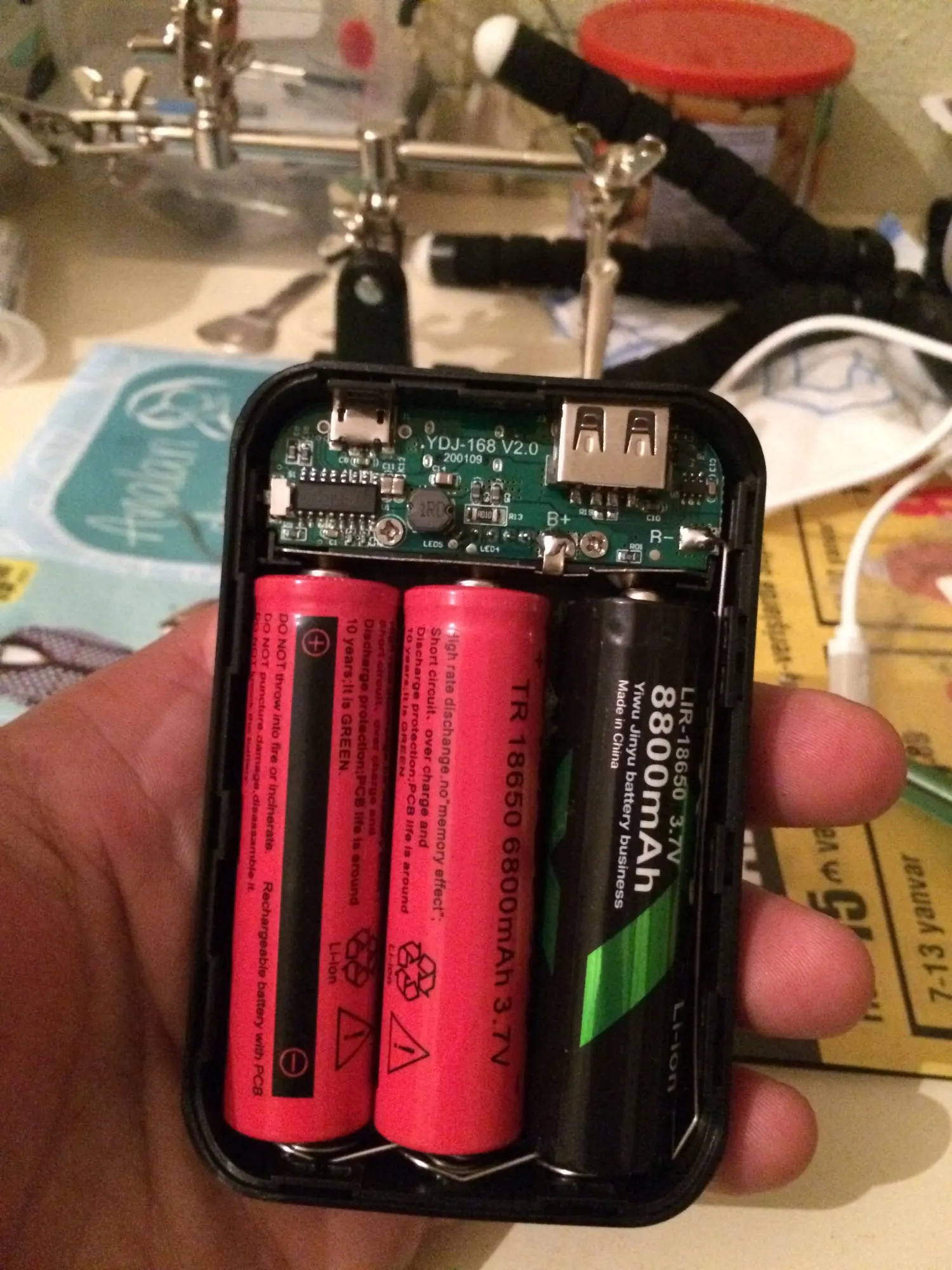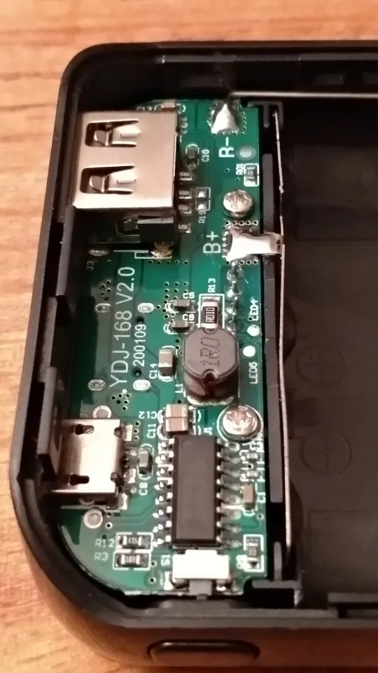 Аккуратно сделан. Продублировал минусовой провод, падение напряжения снизилось с 240мв до 20 мв. ток заряда от адаптера вырос с2,2 а до 2,5 а. Подпилил зубы на крышке, чтобы открывать без потерь. Не понятна функция кнопки рядом с микросхемой. При нажимании на дисплей щелкает, как будто под ним спрятана кнопка, но ничего не происходит. Проверю в эксплуатации.