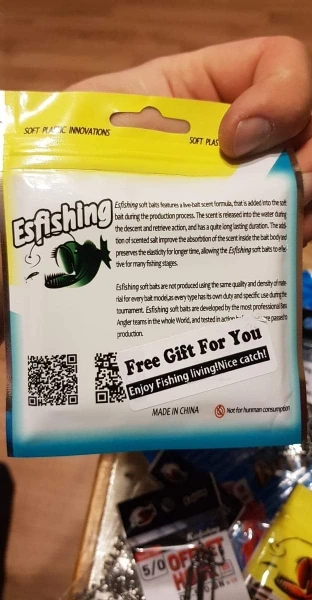 Всё соответствии описанию.Товар качественный ,что по своему виду и упаковке ,также не имеет специфического запаха ,присутствуют съедобный запах ,приманка вся в смазке.Еще считаю плюсом ++магазин положил 2 подарочных пакета .О доставке :14 ноября выслали 4 декабря на таможне и здесь пошёл завис посылки ,мне ещё объединили одну мою посылку но с другого магазина,трек перестал отслеживаться (эта проблема была не только с мои заказом ,у моего знакомого тоже 4 декабря такая проблема )Вот только 27 декабря прибыла на мой почтам.Но это не вена магазина .Мой вердикт -этот Магазин остаеться у меня в закладках ,а я с 2016 года на просторах АлиЭкспресса уже разбираюсь в качественных магазинах.Всех с наступающим новым годом!Нам покупателям возможность покупать и не попадать в просак (это промежуток между п..и .ж)А продавцу побольше покупателей!!