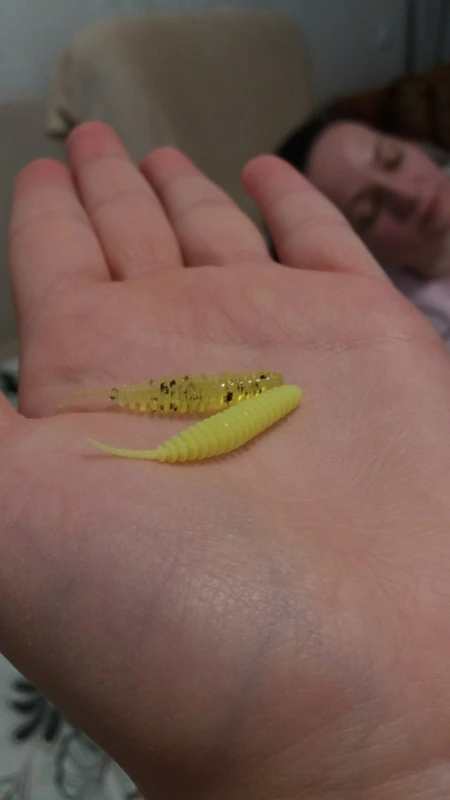 Хорошее качество, силикон съедобный без какого либо выраженного запаха, по размеру думал будут чуть объемнее, на фото в сравнении с ларвой от фанатика, ловить будут точно, хорошо упакованы и наклейка в подарок, спасибо продавцу