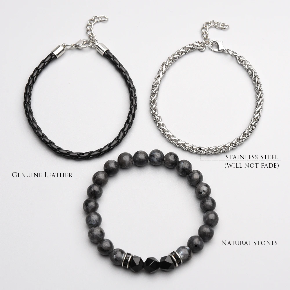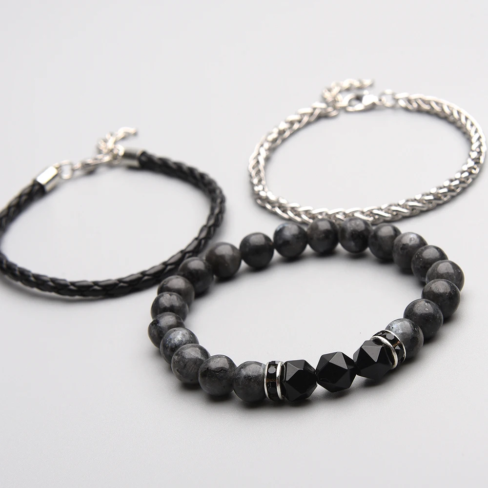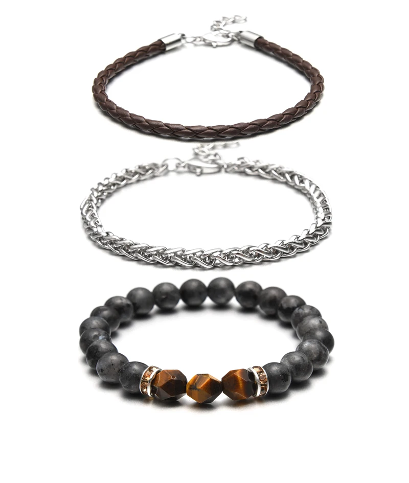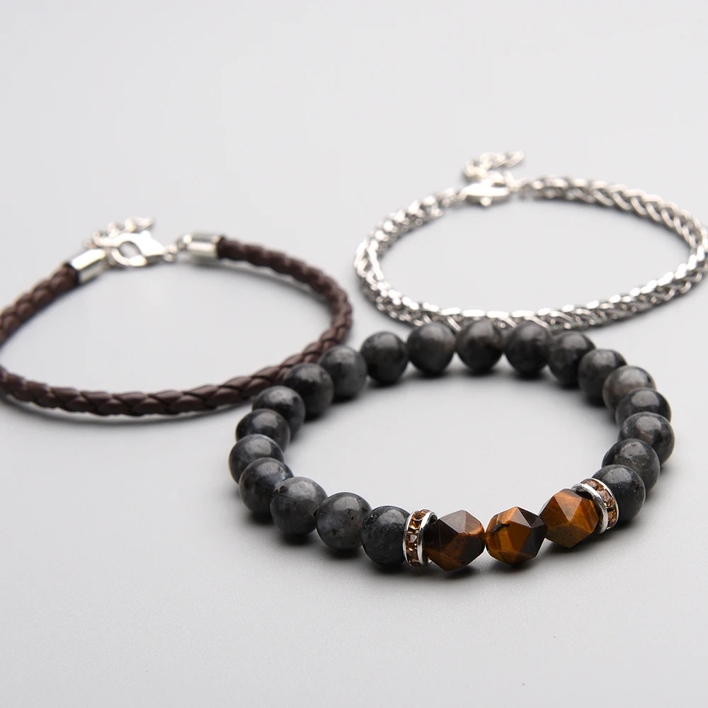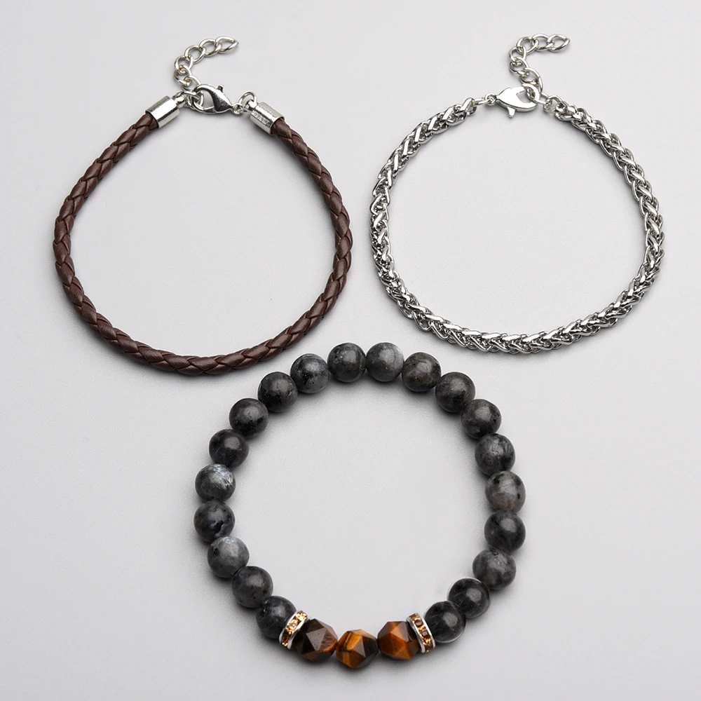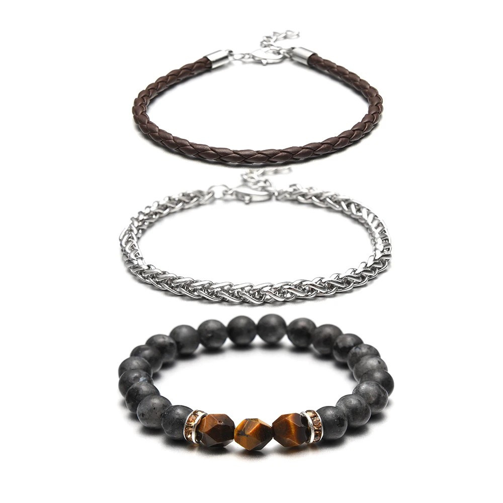 Мужской очаровательный браслет, 3 шт.лот, набор, ручная работа, сделай сам, микс из натурального камня, Классический бисер, натуральная кожа и цепочка из нержавеющей стали