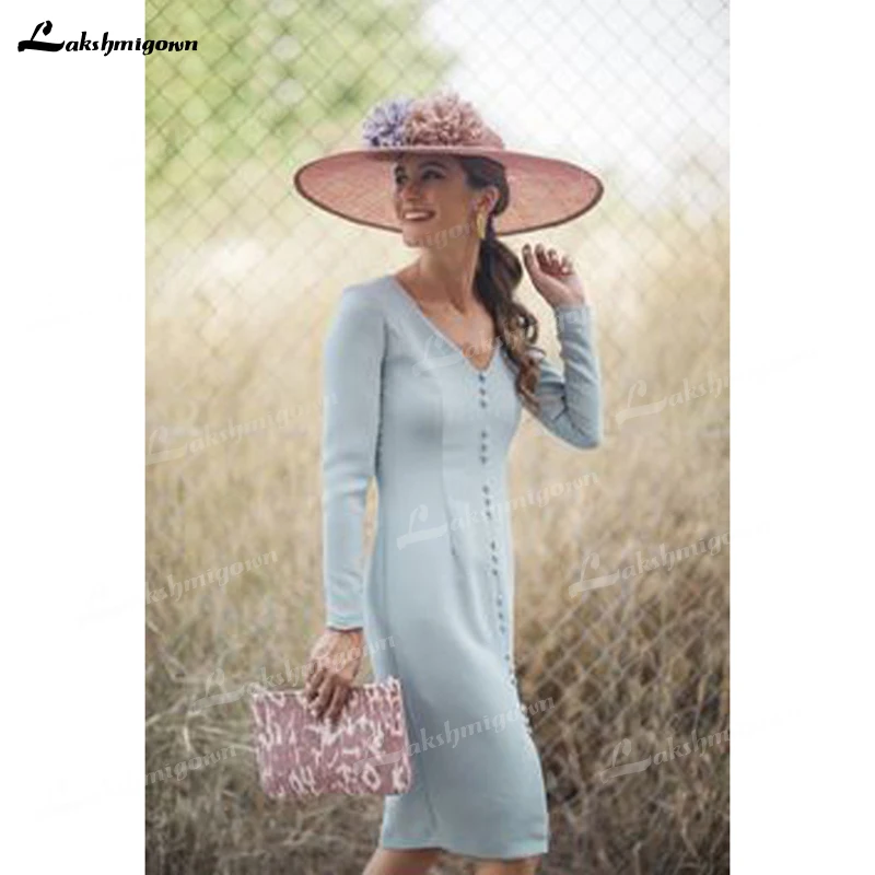 Элегантное платье для матери невесты, свадебное бирюзовое платье до колена с длинным рукавом и V-образным вырезом, на пуговицах, vestido de madrinha