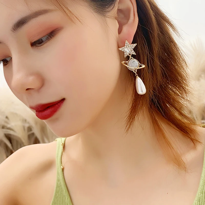 Женские серьги-клипсы с имитацией жемчуга в форме капли воды серебряного цвета, стразы с длинной луной, звездой, планетой, без пирсинга