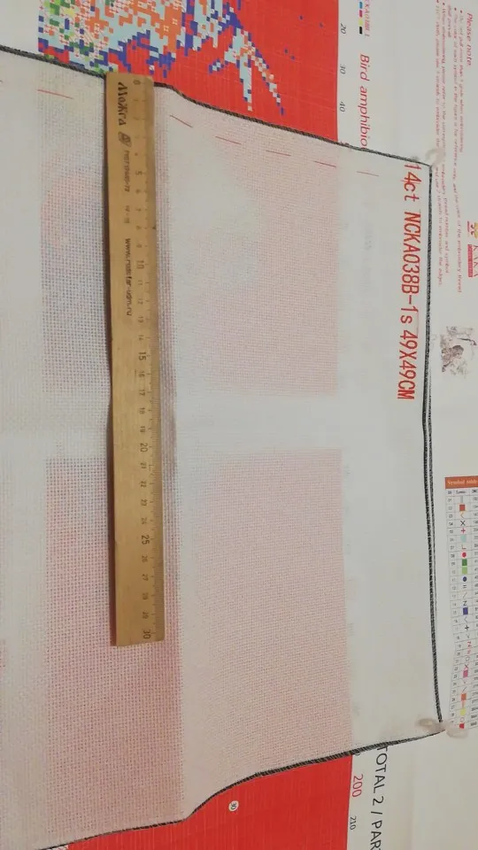 Все прекрасно, но канва... Вообще не подходит. Во-первых, она совсем не 49*49, гораздо меньше. Я разделила на столбики, не влезет даже предложенный рисунок, не говоря уже о том, чтобы оставить запас, чтобы потом в рамку вставить. Канва, конечно, хорошая, блестящая, плотная, но не для этой работы. Ещё и эти огромные красные цифры... Их нужно постараться спрятать под ниткой. Хорошие нитки, хорошая упаковка и всякие непонятные мне штучки для работы)) конечно, купить канву не проблема. Но все равно немножко неприятно)
