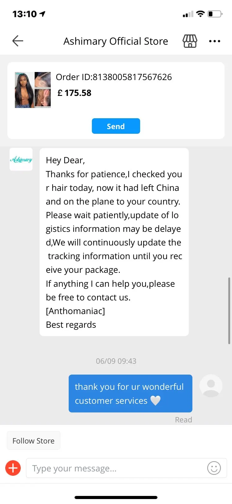 Absolutely amazing customer services. kept me updated throughout the whole shipment. There was no smell hair was exactly as described. Ran my fingers through the hair it was extremely soft no shedding. will be buying again especially due to the price. Amazing. Also i made the shipment on the 4th and received on 8th such fast delivery
