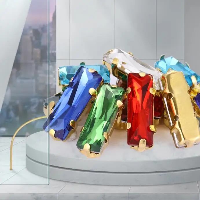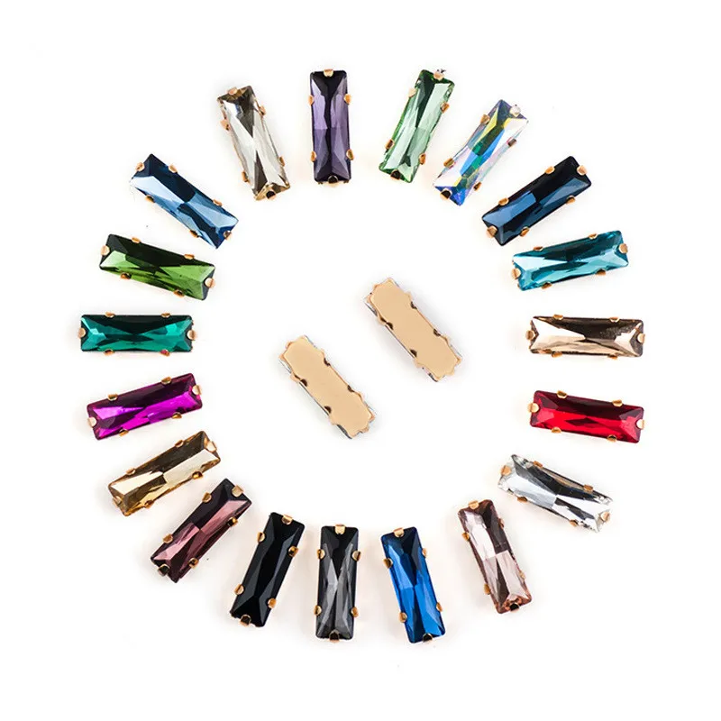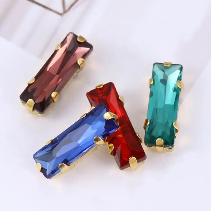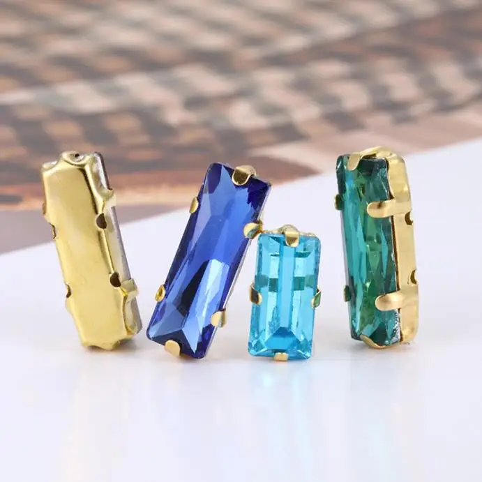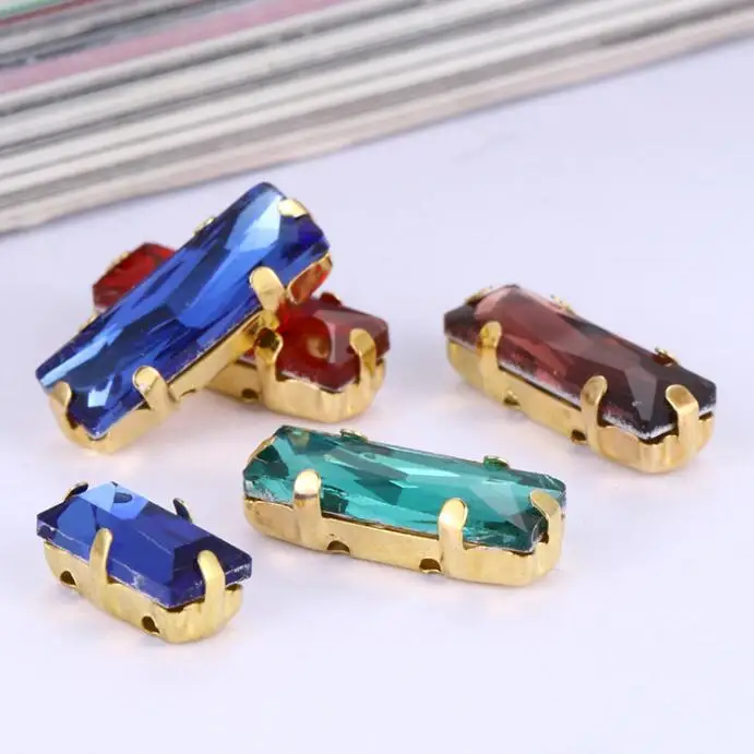 Бесплатная доставка, 5x10 5x15 7x21 мм, смешанные цвета, стеклянная багета, хрустальные стразы для шитья с золотым когтем, сделай сам, аксессуары для одежды
