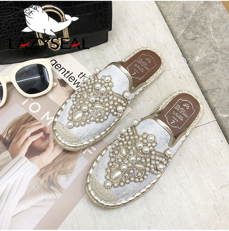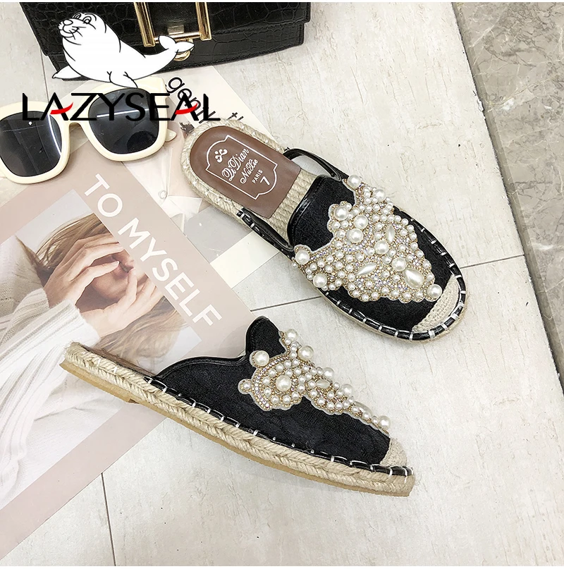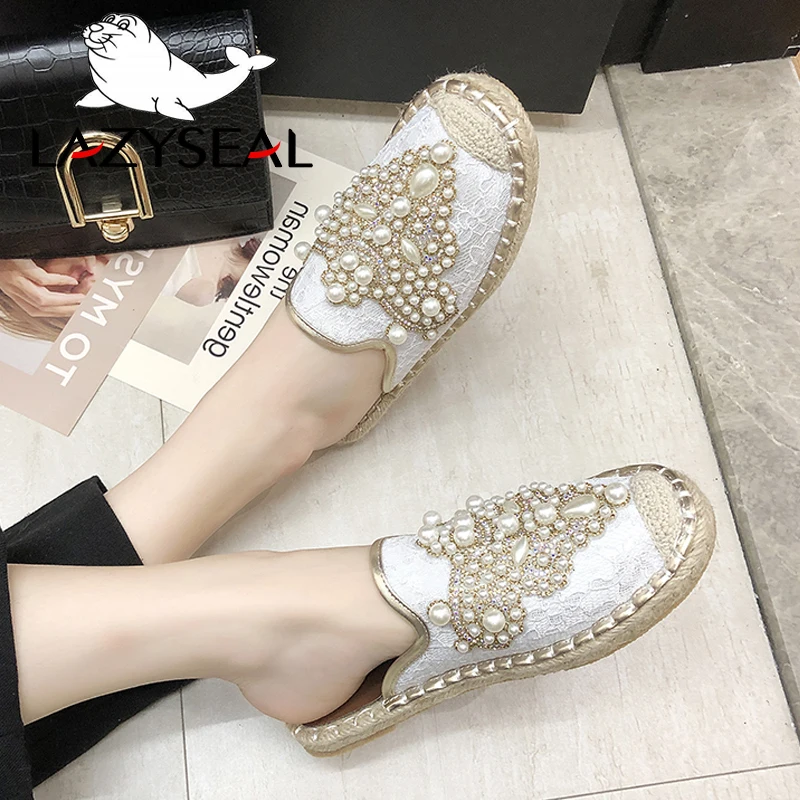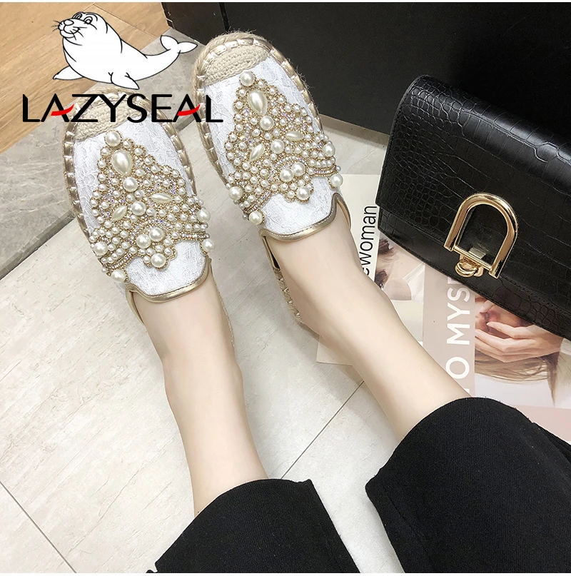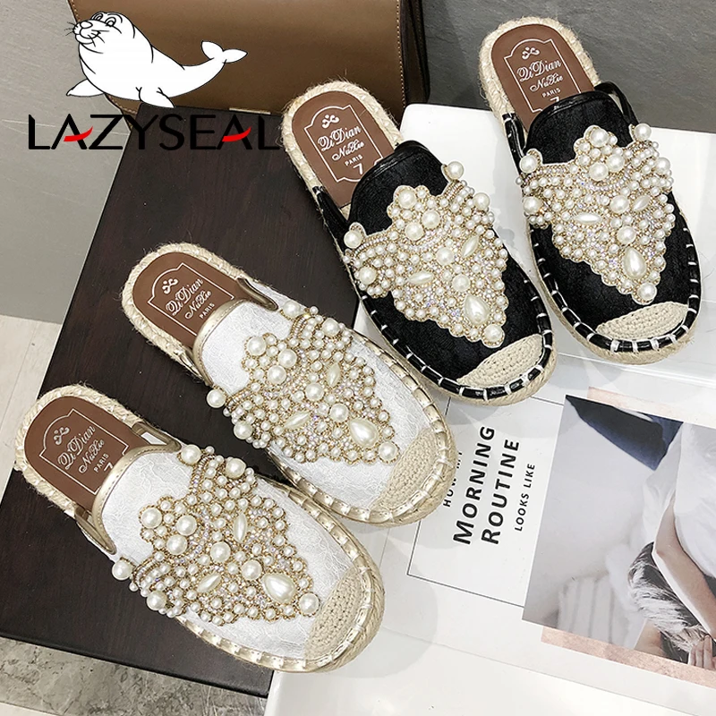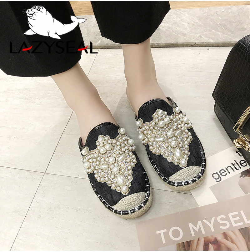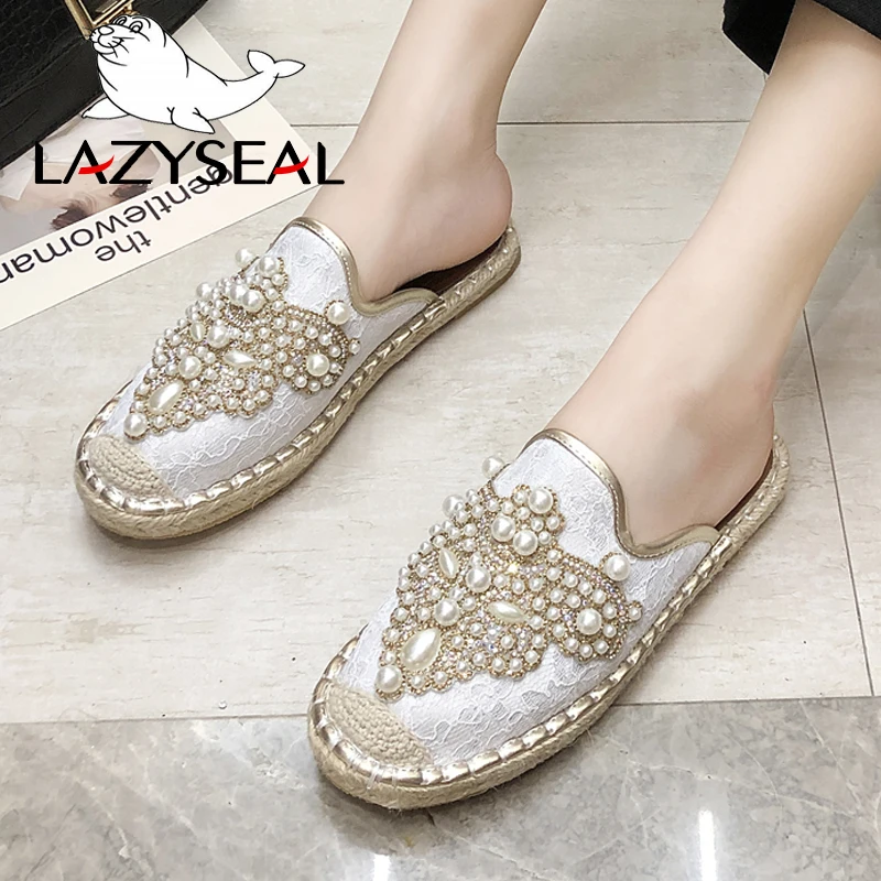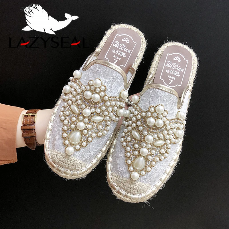 Женские шлепанцы LazySeal, весенние шлепанцы на плоской подошве из конопли, с жемчугом, из хлопчатобумажной ткани