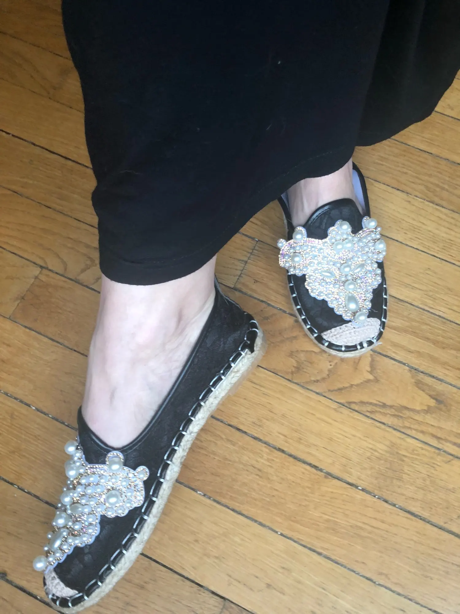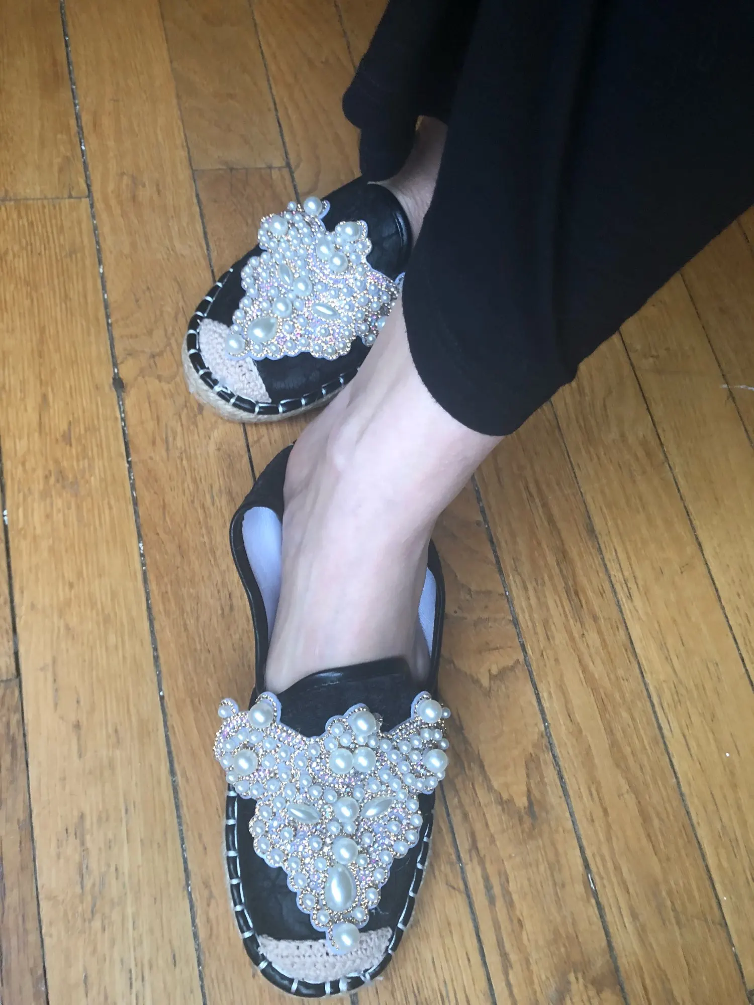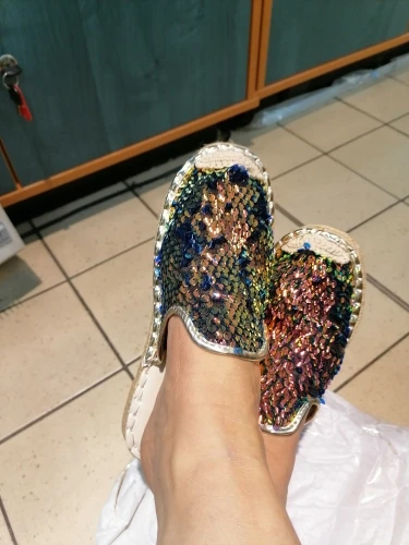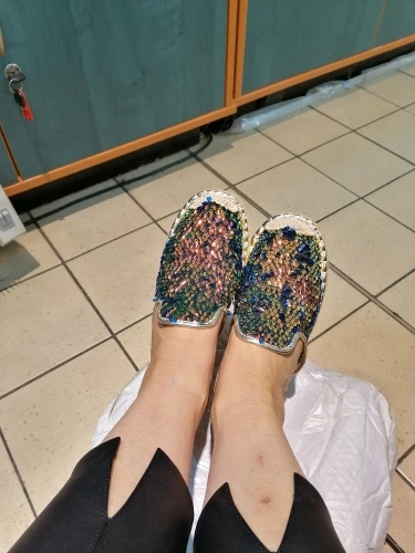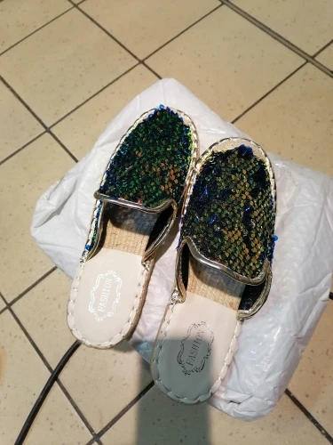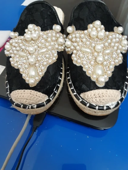 Качество не такое большое, дизайн жемчуга-это наклейка и не очень хорошо приклеивается. Подошло уже снято по бокам. Я должен был добавить клей. Размеры на маленькую ногу 38, я должен был принести 39, это слишком туго, но если вы сложите заднюю часть, чтобы просто носить его дома, это будет делать