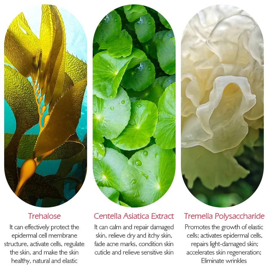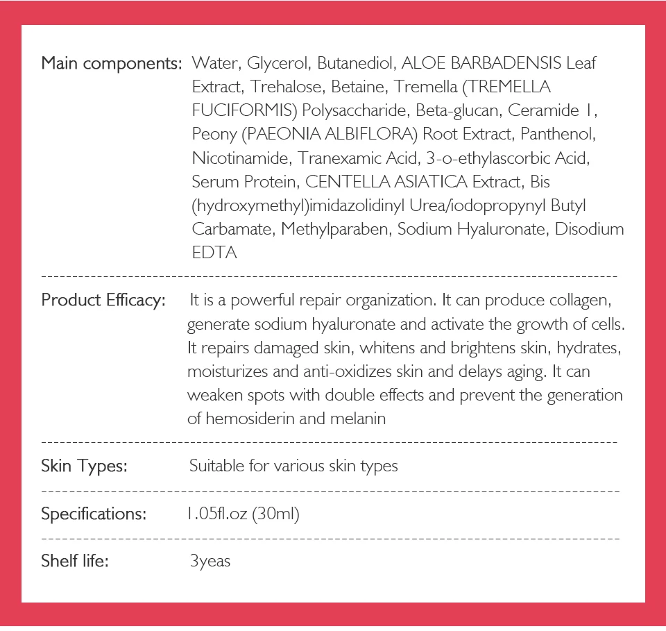 【Эффективность продукта: это мощная ремонтная организация. Он может Вырабатывать Коллаген, генерировать гиалуронат натрия и активировать рост клеток. Восстанавливает поврежденную кожу, отбеливает и осветляет кожу, увлажняет, увлажняет, окисляет кожу и задерживает старение. Может ослабить пятна с двойным эффектом и предотвратить образование гемозидерина и меланина