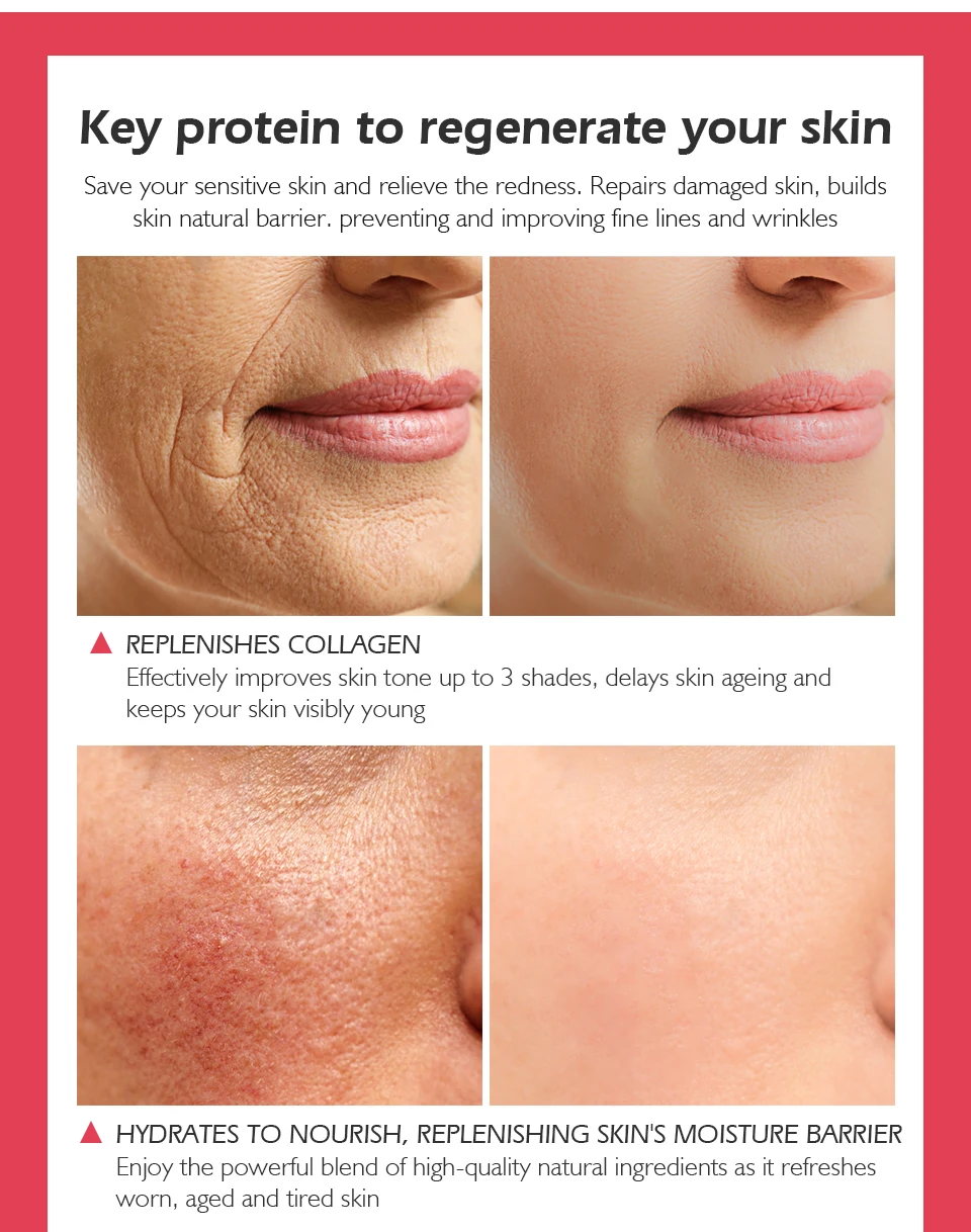 Способствует синтезу коллагена в коже, делая ее гладкой и эластичной день за днем, подтягивая и подтягивая, основной белок для регенерации вашей кожи